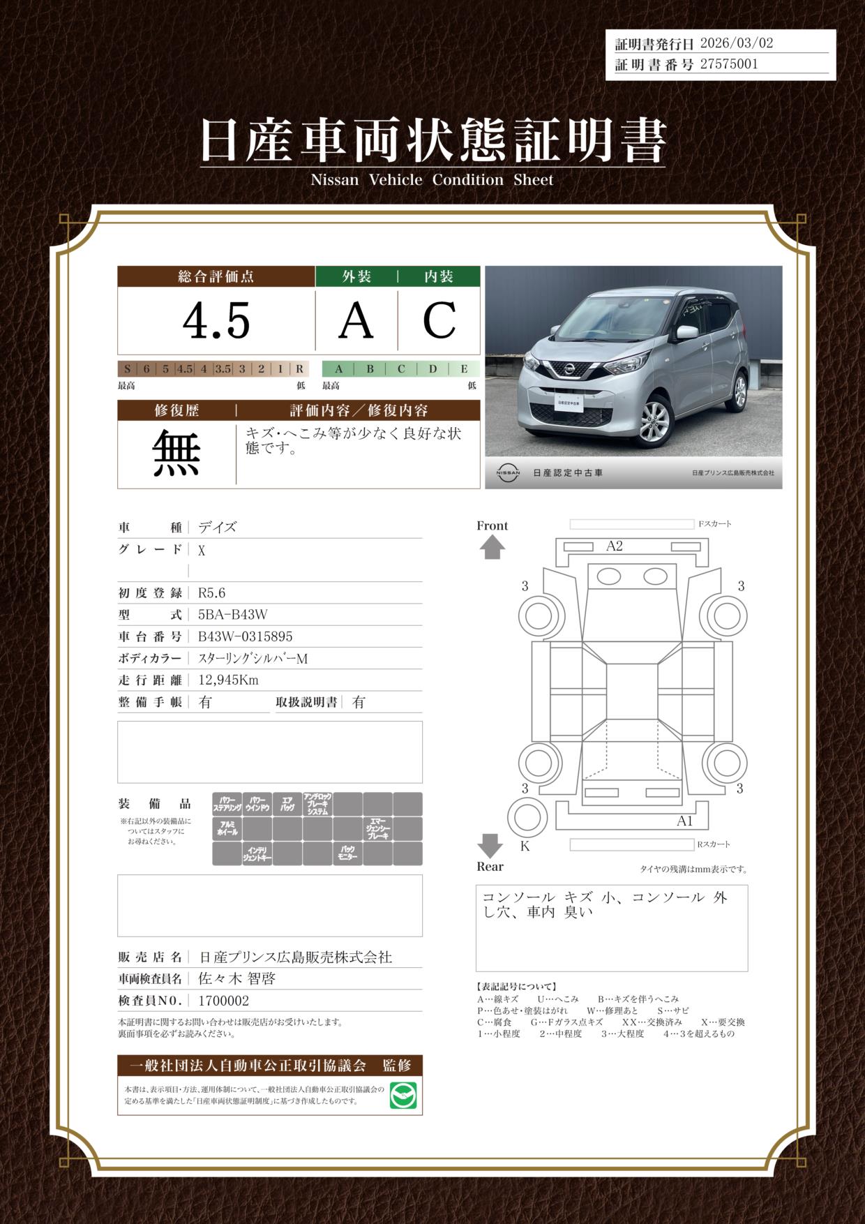 現状括弧書き内の年月まで車検有効期限が残っていますが、ご成約時に新しく車検を取り直します。なお取り直しの費用は車両価格に含まれています。