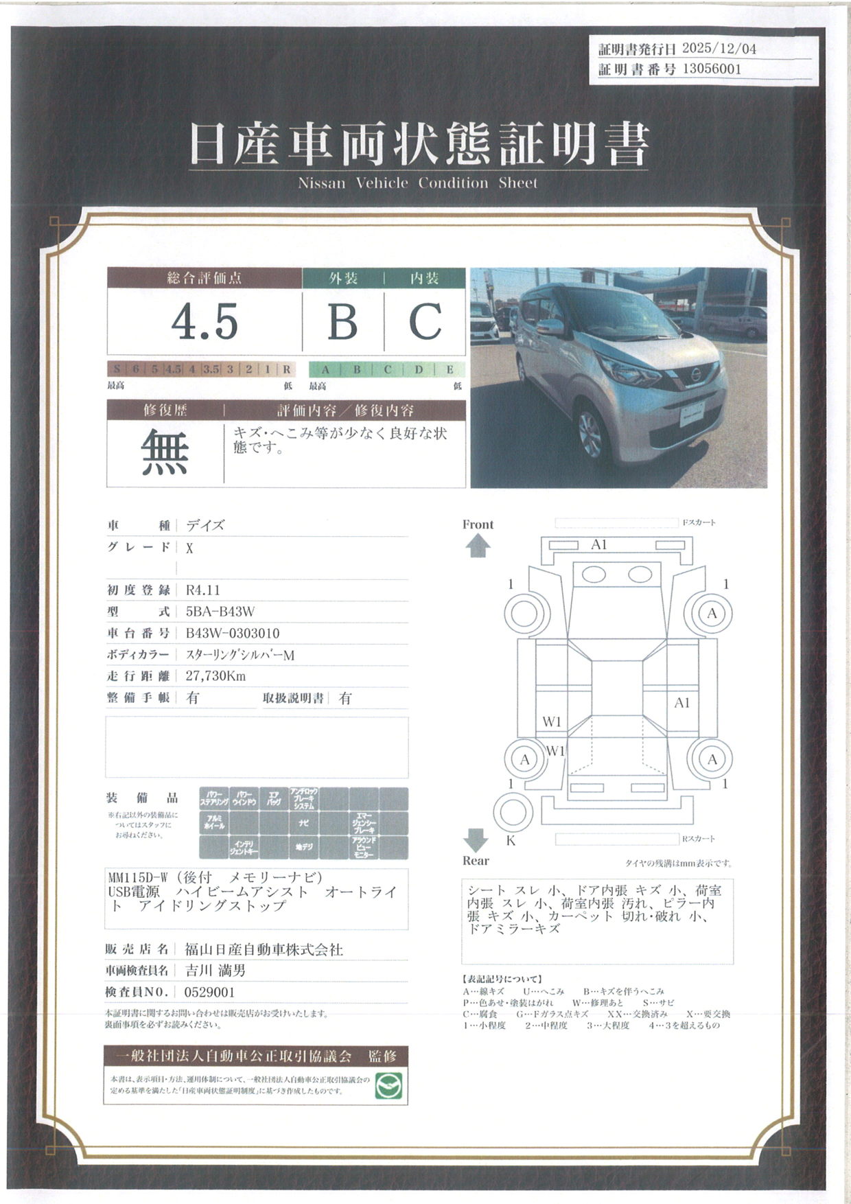 評価機関 : 日産車両状態証明