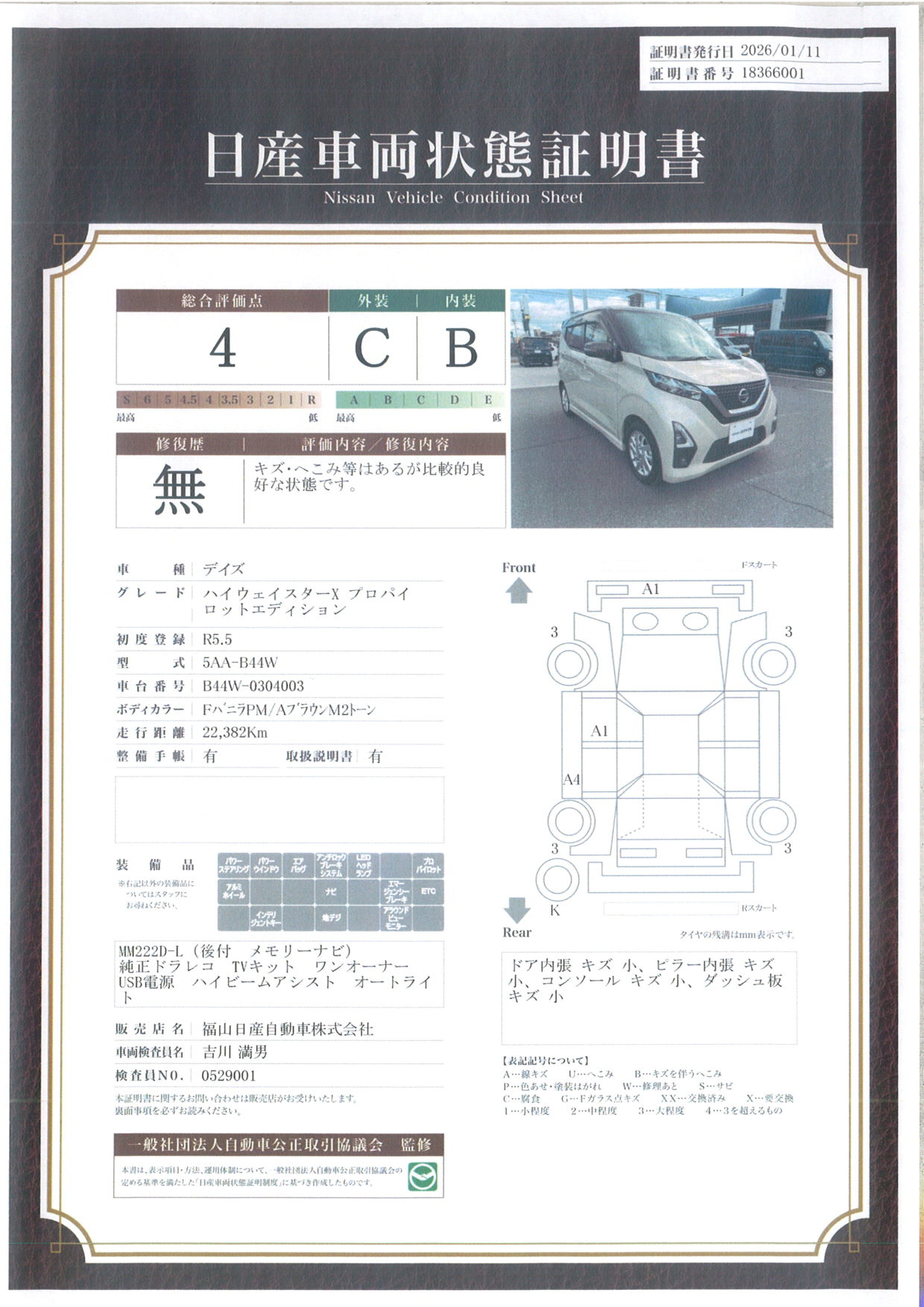 評価機関 : 日産車両状態証明