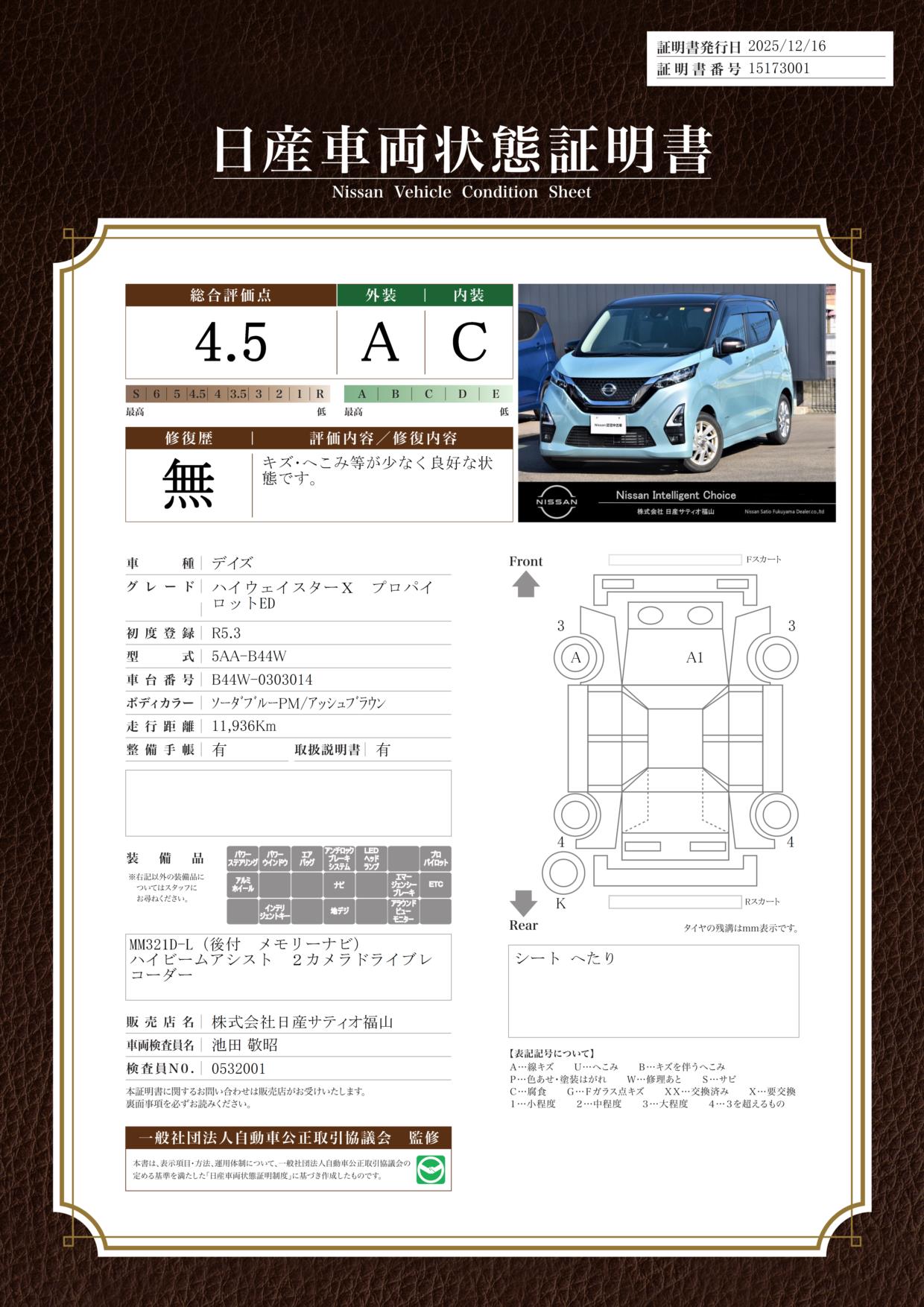当店は全車に『車両状態証明書』を掲示〇◎状態証明書をもとに安心しておクルマをお選びいただけます_(._.)_