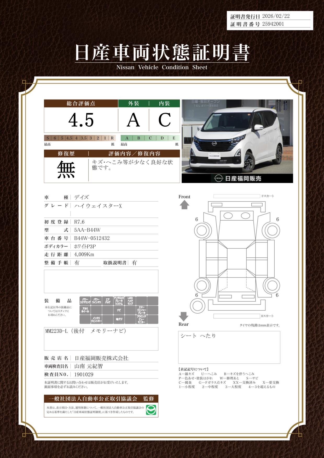 「車両状態証明書」は、査定協会監修のプロの検査員が公正かつ確かな基準で検査した”安心の証”です。