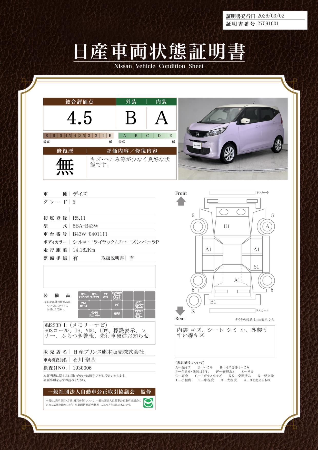 「車両状態証明書」は、査定協会監修のプロの検査員が公正かつ確かな基準で検査した”安心の証”です。