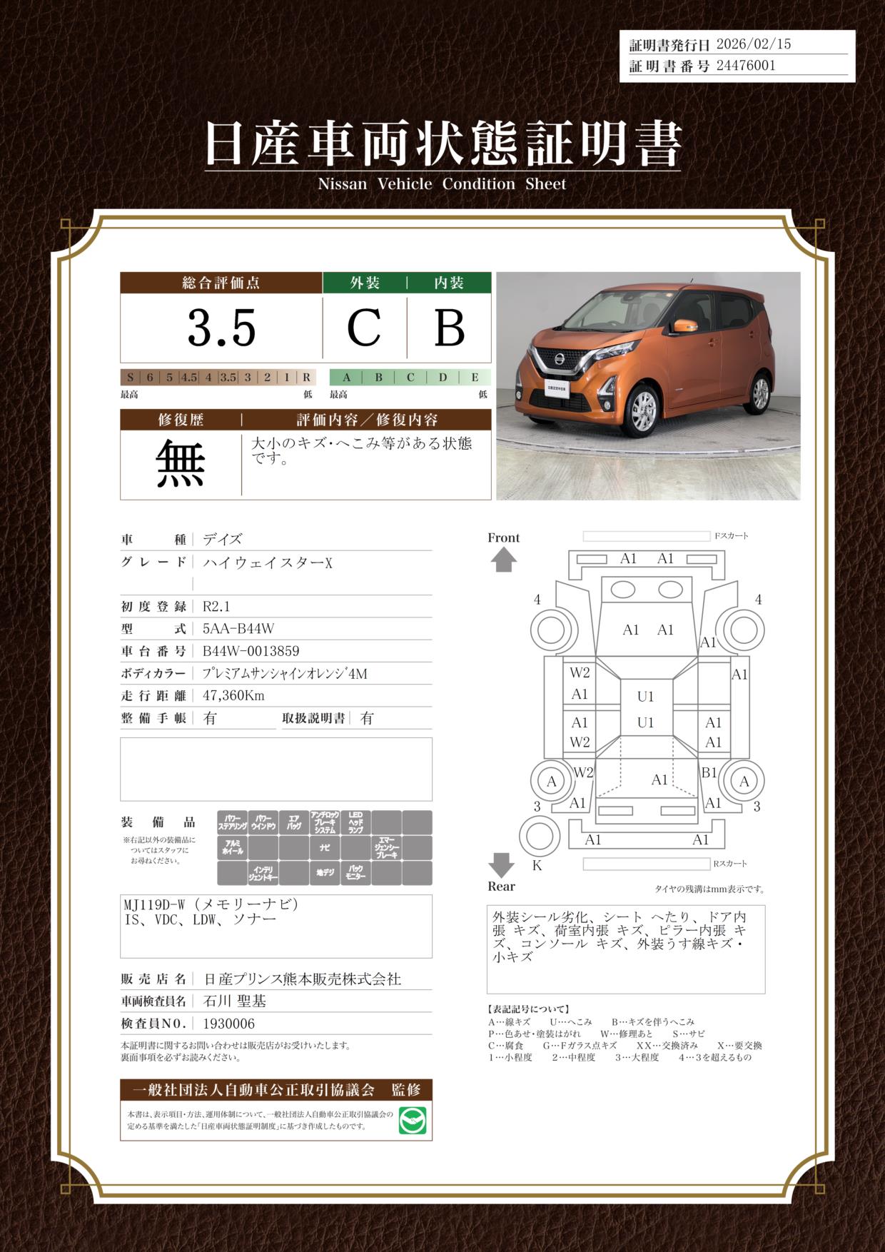現状括弧書き内の年月まで車検有効期限が残っていますが、ご成約時に新しく車検を取り直します。なお取り直しの費用は車両価格に含まれています。