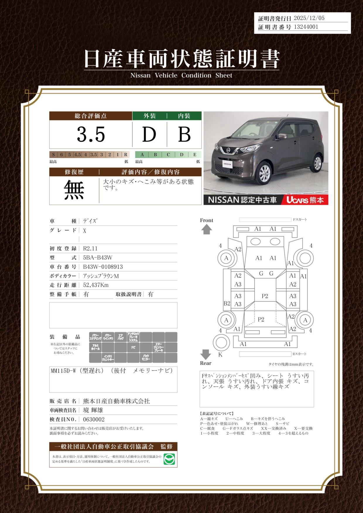 現状括弧書き内の年月まで車検有効期限が残っていますが、ご成約時に新しく車検を取り直します。なお取り直しの費用は車両価格に含まれています。