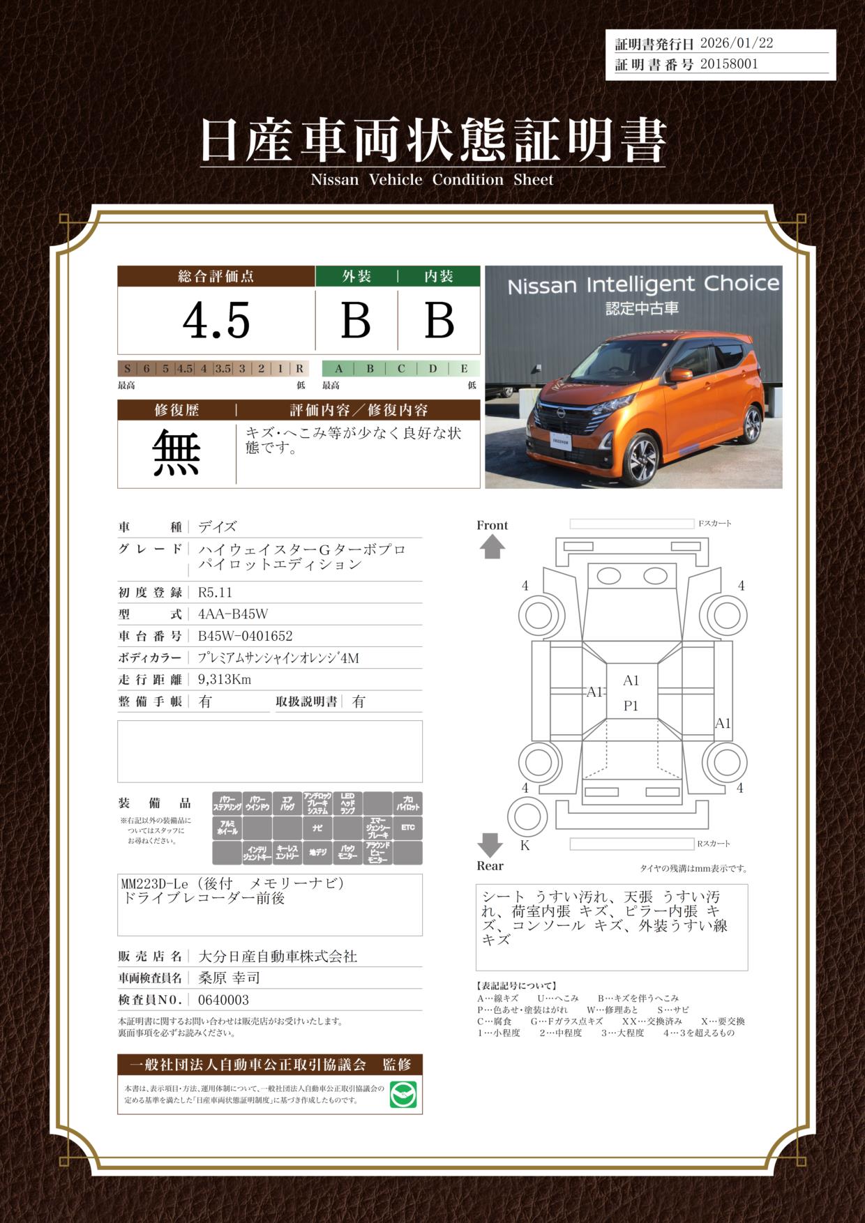 現状括弧書き内の年月まで車検有効期限が残っていますが、ご成約時に新しく車検を取り直します。なお取り直しの費用は車両価格に含まれています。