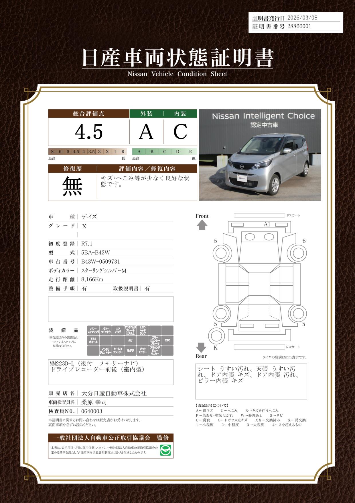 「車両状態証明書」は、査定協会監修のプロの検査員が公正かつ確かな基準で検査した”安心の証”です。