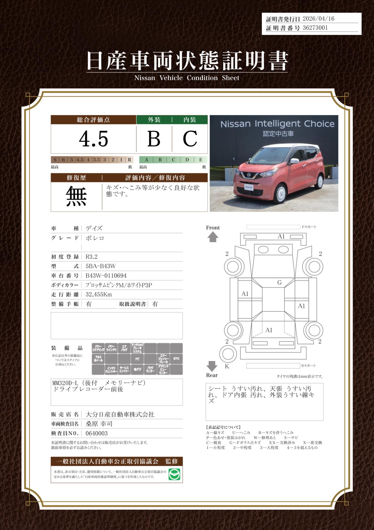 現状車検切れの状態ですが、ご成約時に新しく車検を実施します。車検費用は車両価格に含まれています。