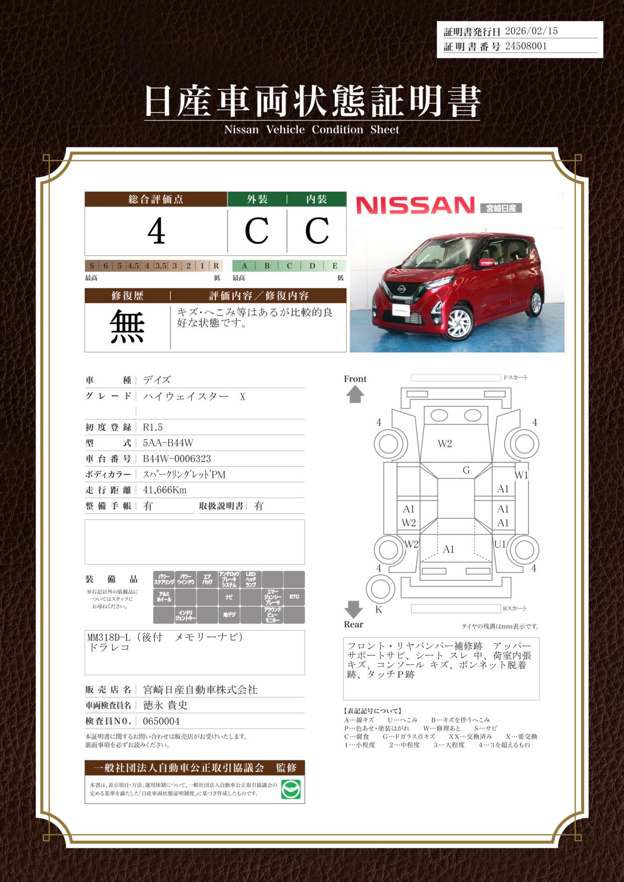 現状括弧書き内の年月まで車検有効期限が残っていますが、ご成約時に新しく車検を取り直します。なお取り直しの費用は車両価格に含まれています。