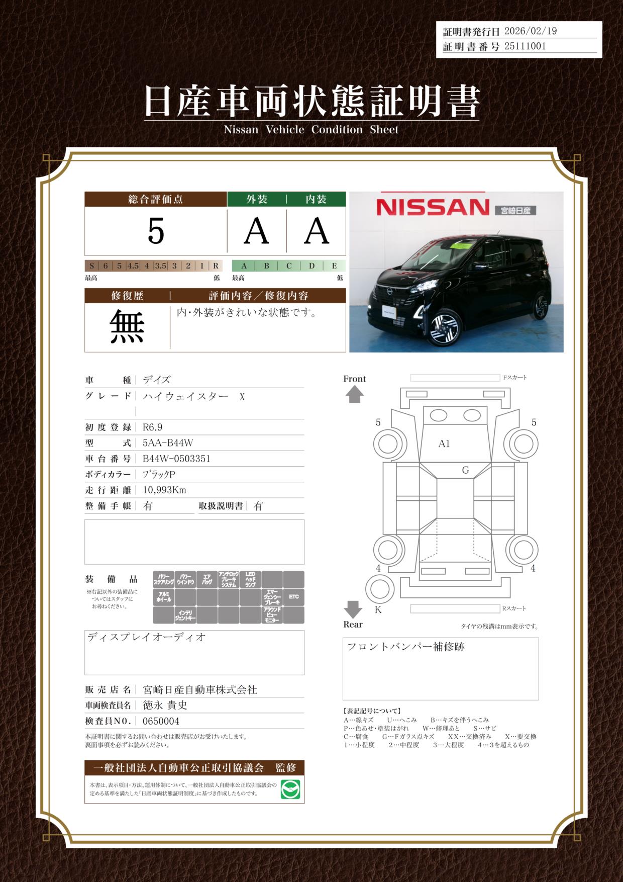 「車両状態証明書」は、査定協会監修のプロの検査員が公正かつ確かな基準で検査した”安心の証”です。