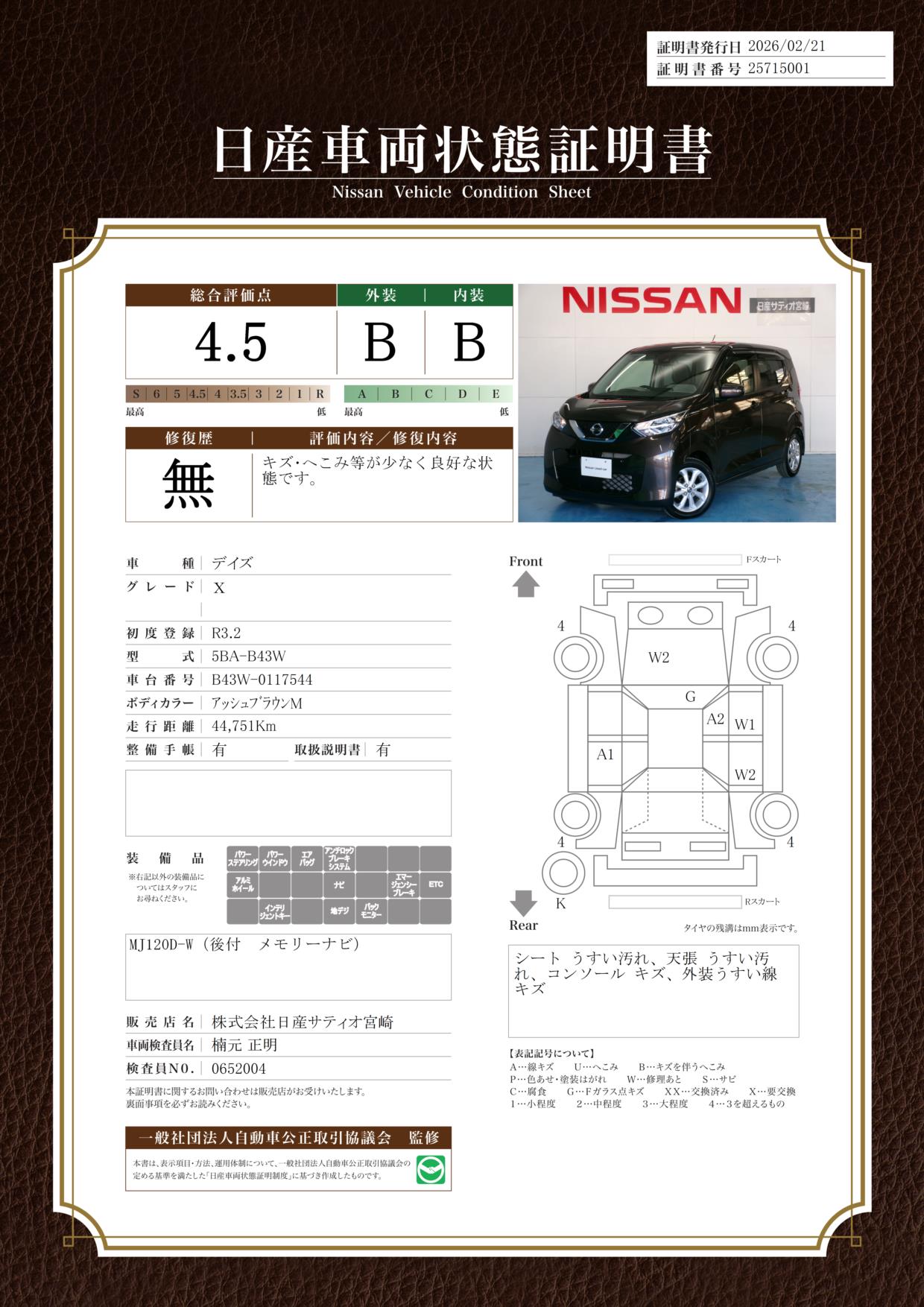 この度は当店を検索頂き誠にありがとうございます。3月は半期に一度の大決算!『決算 特選中古車フェア』を開催!。今話題のe-POWER車や100%電気自動車等、軽から1BOXのお買得車をご用意!更に日産ワイド保証も付いて安心!ご来場を心よりお待ちしております。フェア期間R8年3月2日(月)~R8年3月29日(日)迄。毎週、火・水曜日が定休日。