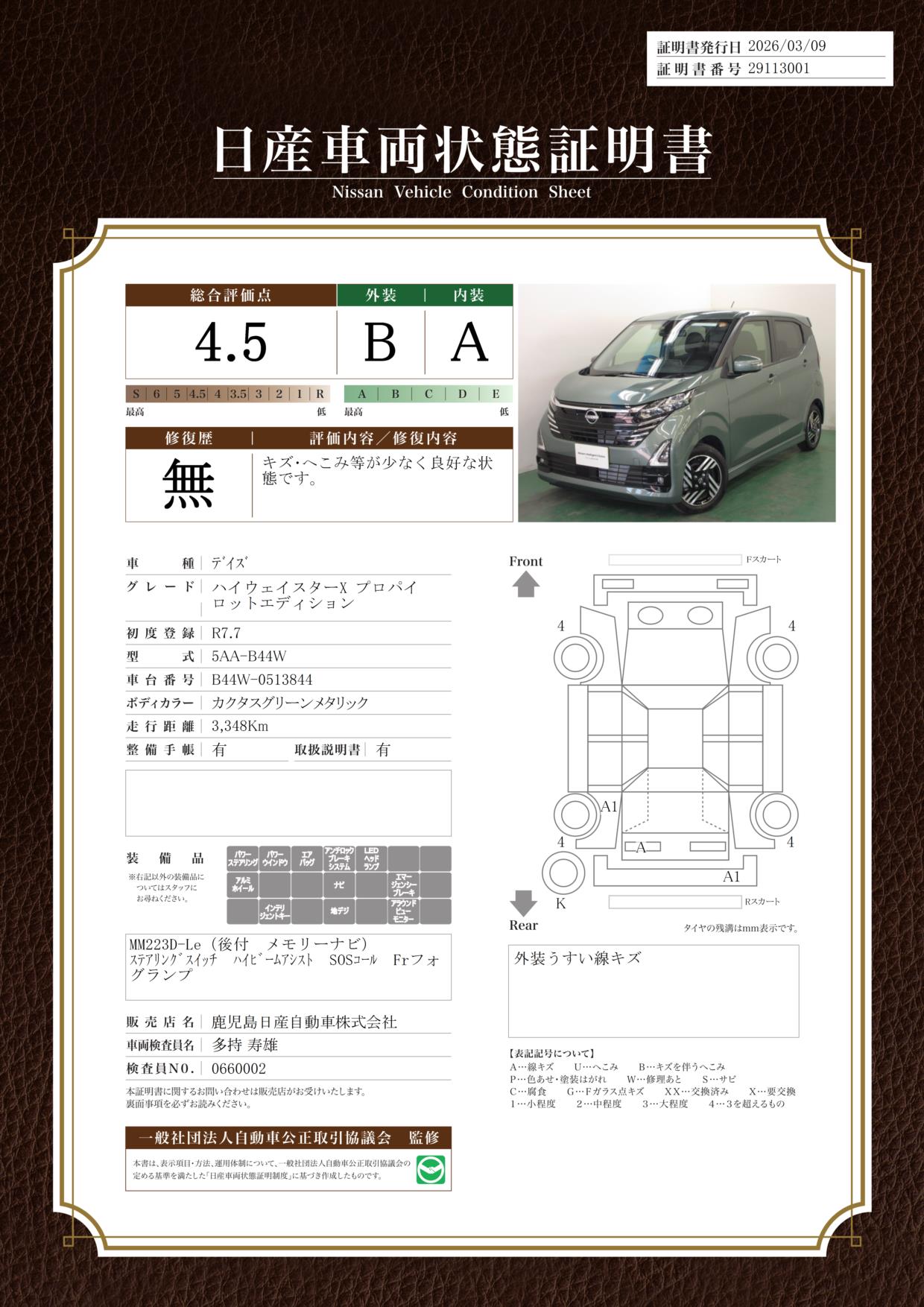 「車両状態証明書」は、査定協会監修のプロの検査員が公正かつ確かな基準で検査した”安心の証”です。