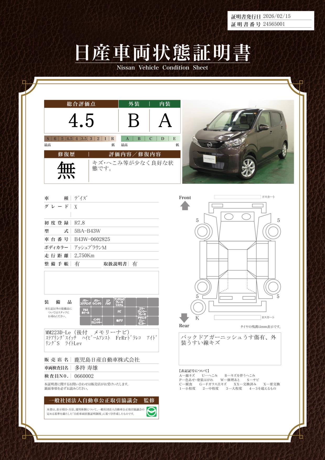 現状括弧書き内の年月まで車検有効期限が残っていますが、ご成約時に新しく車検を取り直します。なお取り直しの費用は車両価格に含まれています。