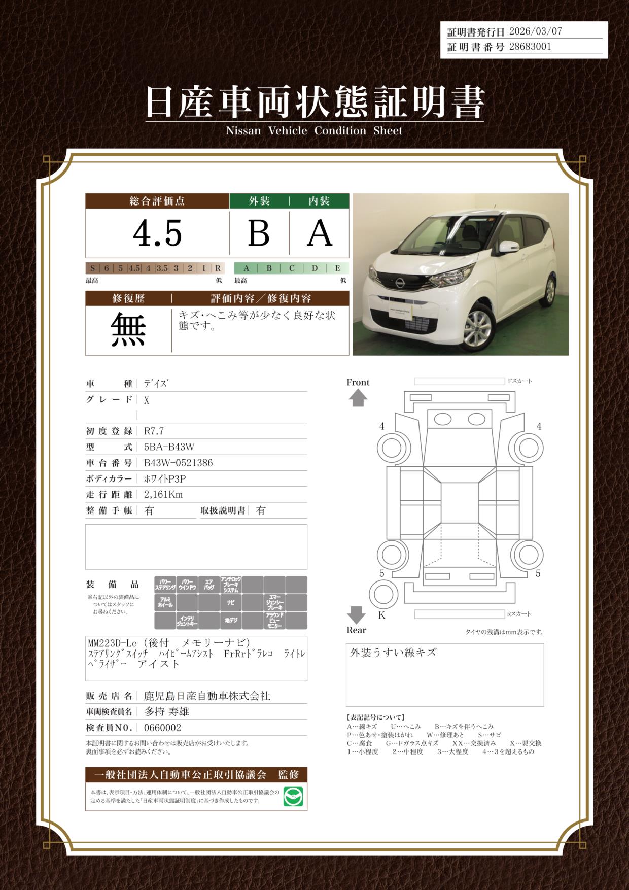 「車両状態証明書」は、査定協会監修のプロの検査員が公正かつ確かな基準で検査した”安心の証”です。