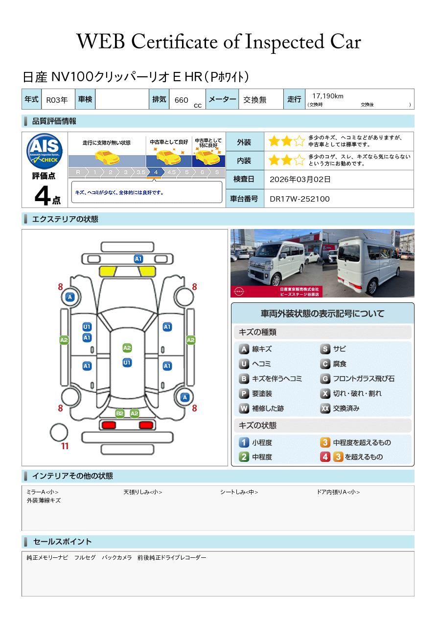 評価機関 : 日産車両状態証明