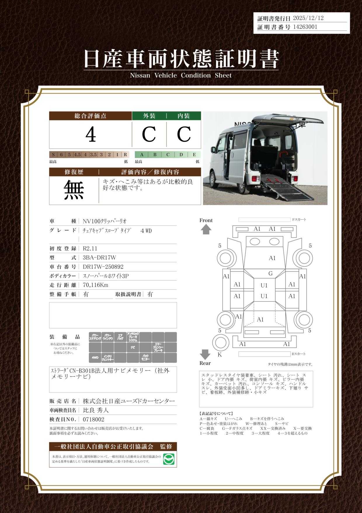 ストラーダCN-B301B法人用メモリーナビ・バックビューモニター・運転席シートヒーター4WD車・車いす1台・全国どこでも納車できます!お気軽にお問い合わせください。