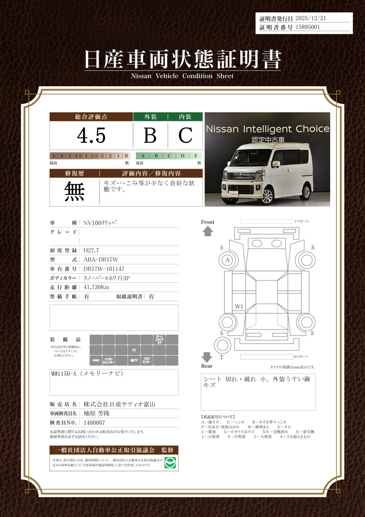 評価機関 : 日産車両状態証明