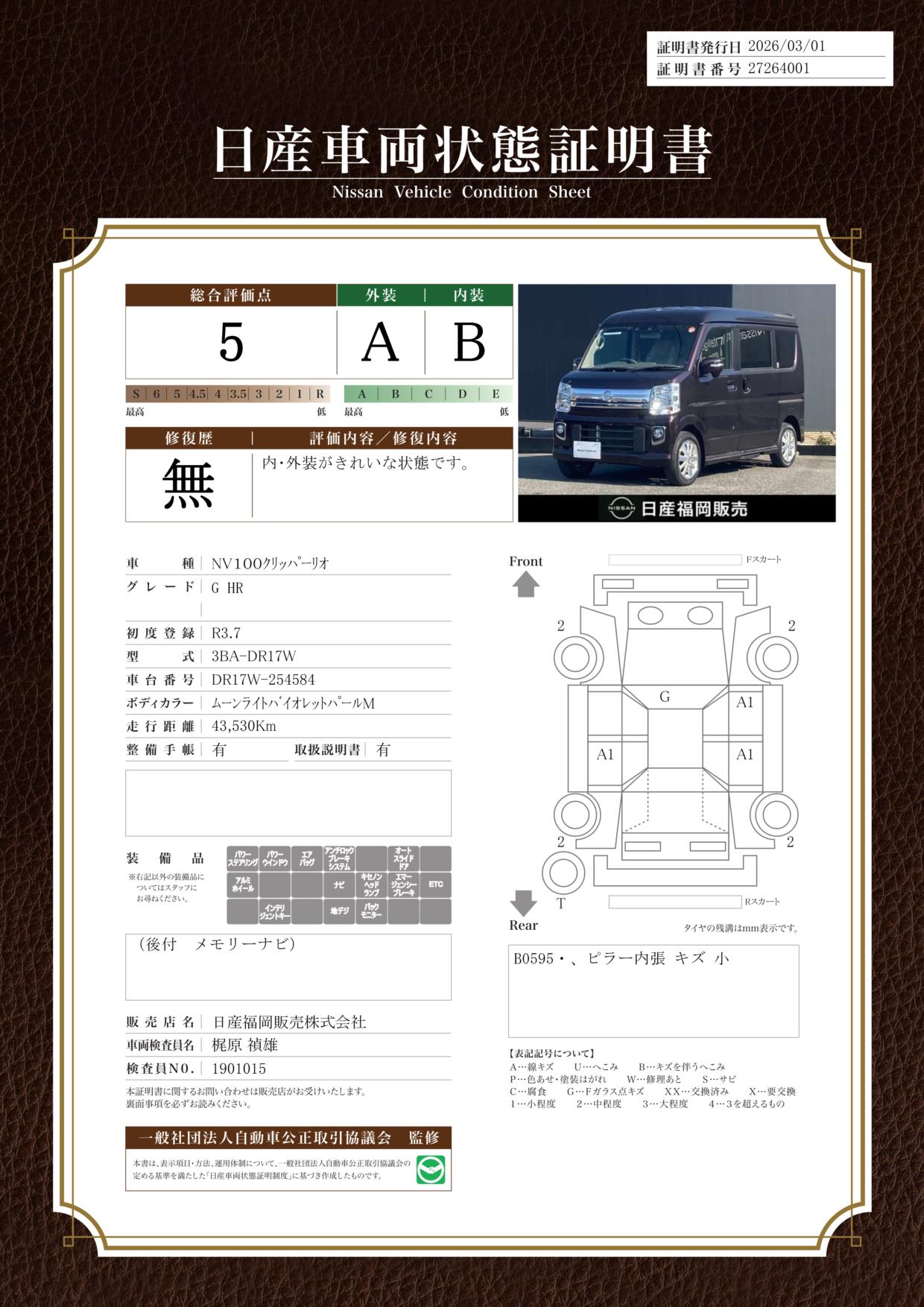 「車両状態証明書」は、査定協会監修のプロの検査員が公正かつ確かな基準で検査した”安心の証”です。
