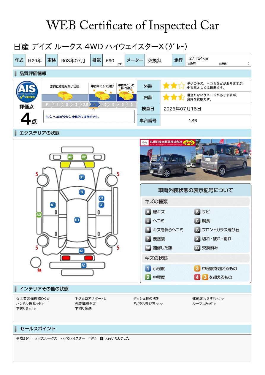 平成29年 デイズルークス ハイウェイスター 4WD 白 入荷いたしました