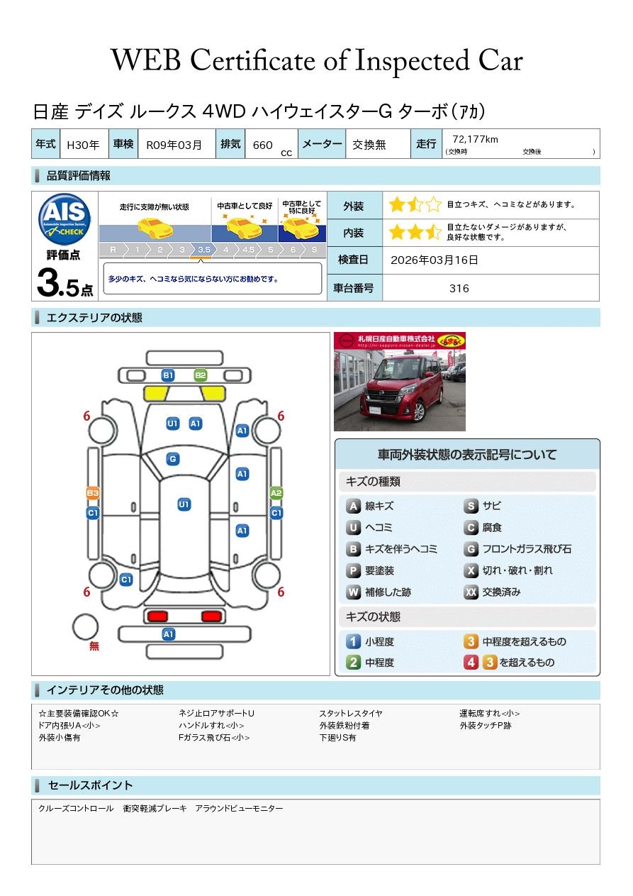 日産車は勿論のこと他メーカーでも軽自動車からミニバンまで幅広く展示中! 新車中古車併売店ですので、新車販売もOK! AIS評価書付車両(第三者評価書)も多数ございますので、ご安心ください♪ 安心の日産「ワイド保証」や「自社指定工場」完備! 岩見沢インターすぐ側です♪(札幌ジャンクションより約30分) スタッフ一同お待ち申し上げております^^ 全車走行メーター管理システム導入☆(日本オートオークション協議会)