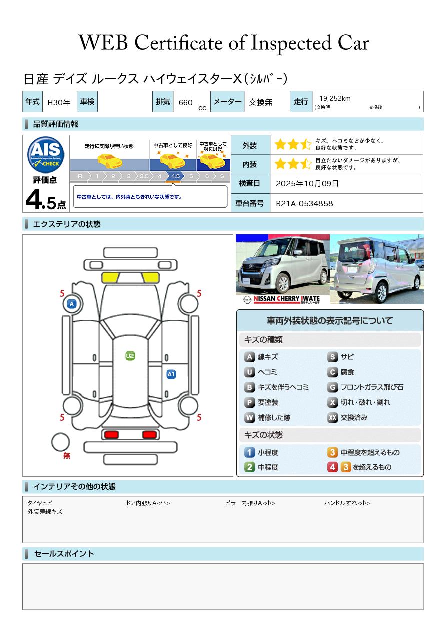 評価点イメージ : 中古車としては、内外装ともきれいな状態です。