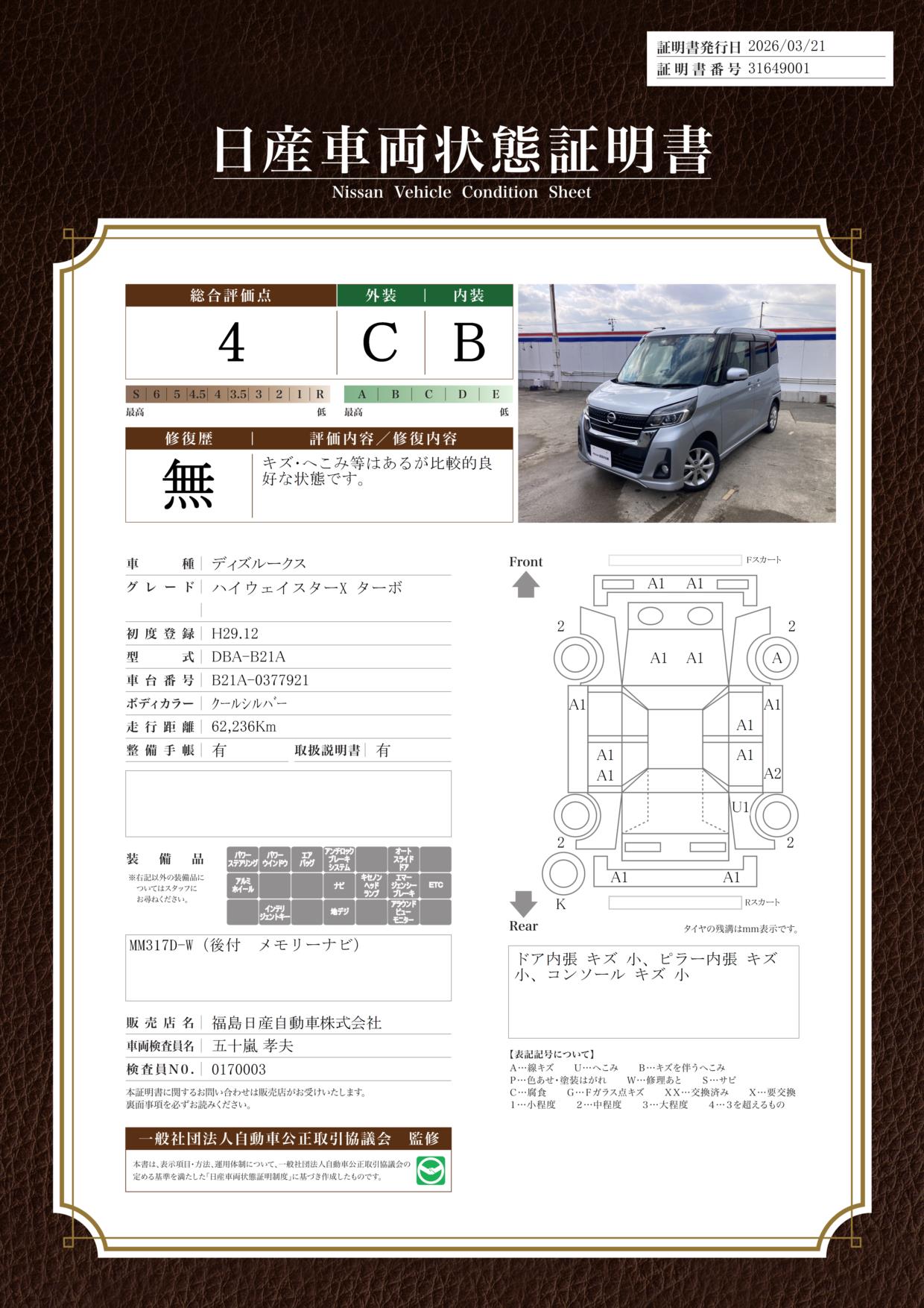 現状括弧書き内の年月まで車検有効期限が残っていますが、ご成約時に新しく車検を取り直します。なお取り直しの費用は車両価格に含まれています。