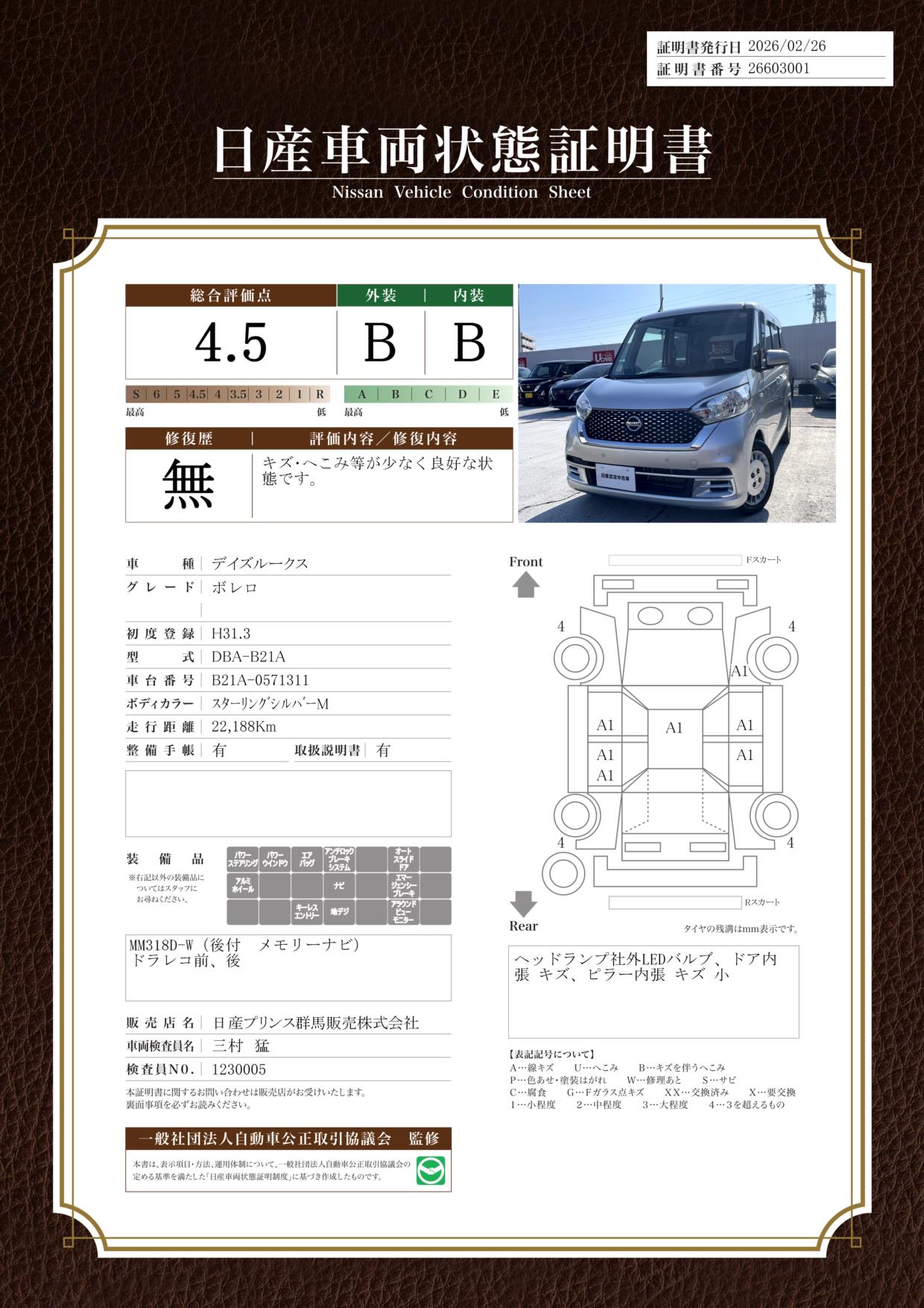現状括弧書き内の年月まで車検有効期限が残っていますが、ご成約時に新しく車検を取り直します。なお取り直しの費用は車両価格に含まれています。