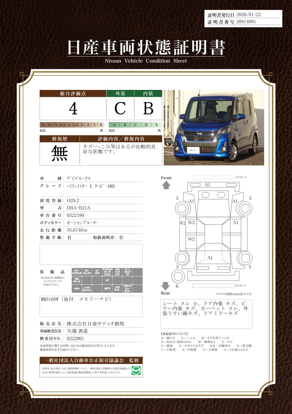 現状括弧書き内の年月まで車検有効期限が残っていますが、ご成約時に新しく車検を取り直します。なお取り直しの費用は車両価格に含まれています。