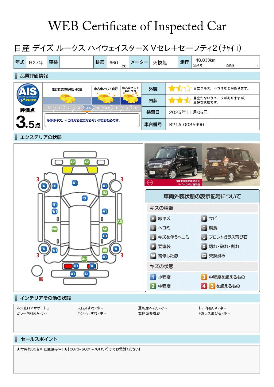 デイズルークス 660cc 660 X Vセレクション +SafetyII 純正メモリーナビバックモニター