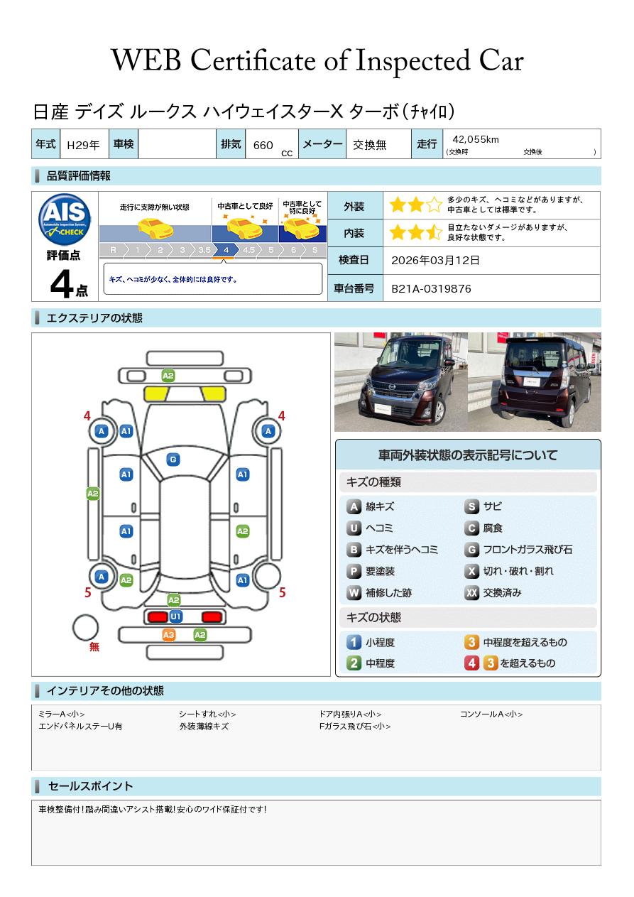 現状括弧書き内の年月まで車検有効期限が残っていますが、ご成約時に新しく車検を取り直します。なお取り直しの費用は車両価格に含まれています。