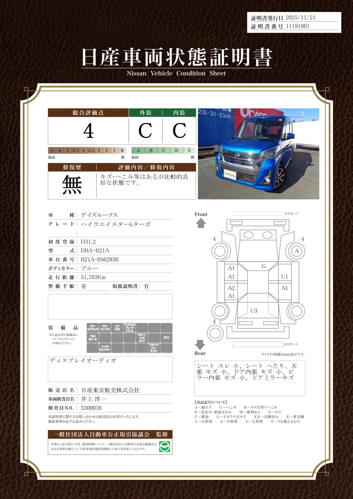 評価機関 : 日産車両状態証明