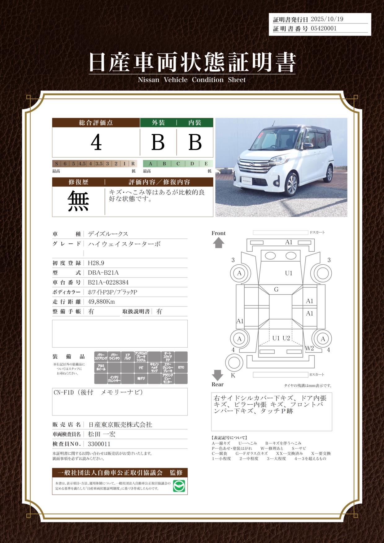 デイズルークス 660cc 660 X 4WD 純正メモリナビ エマブレ 左側オートSD