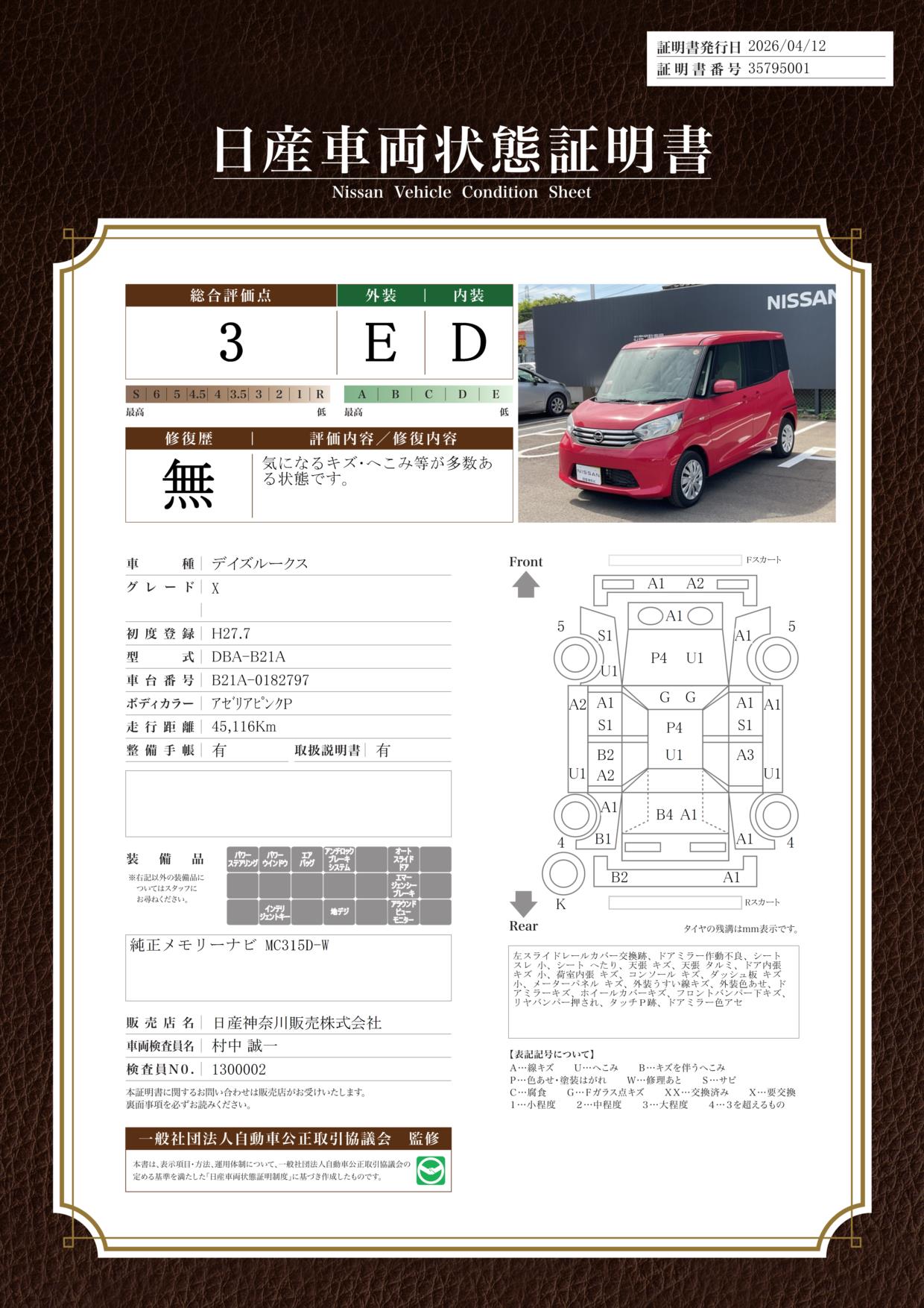 【 O U T L E T 車】・・内外装現状での販売のお車です。ご納車前に整備をします☆これにより保証が付きます→全国の日産のお店で使える保証です☆