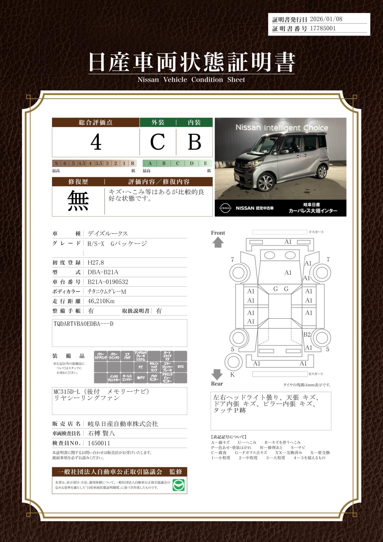 現状括弧書き内の年月まで車検有効期限が残っていますが、ご成約時に新しく車検を取り直します。なお取り直しの費用は車両価格に含まれています。