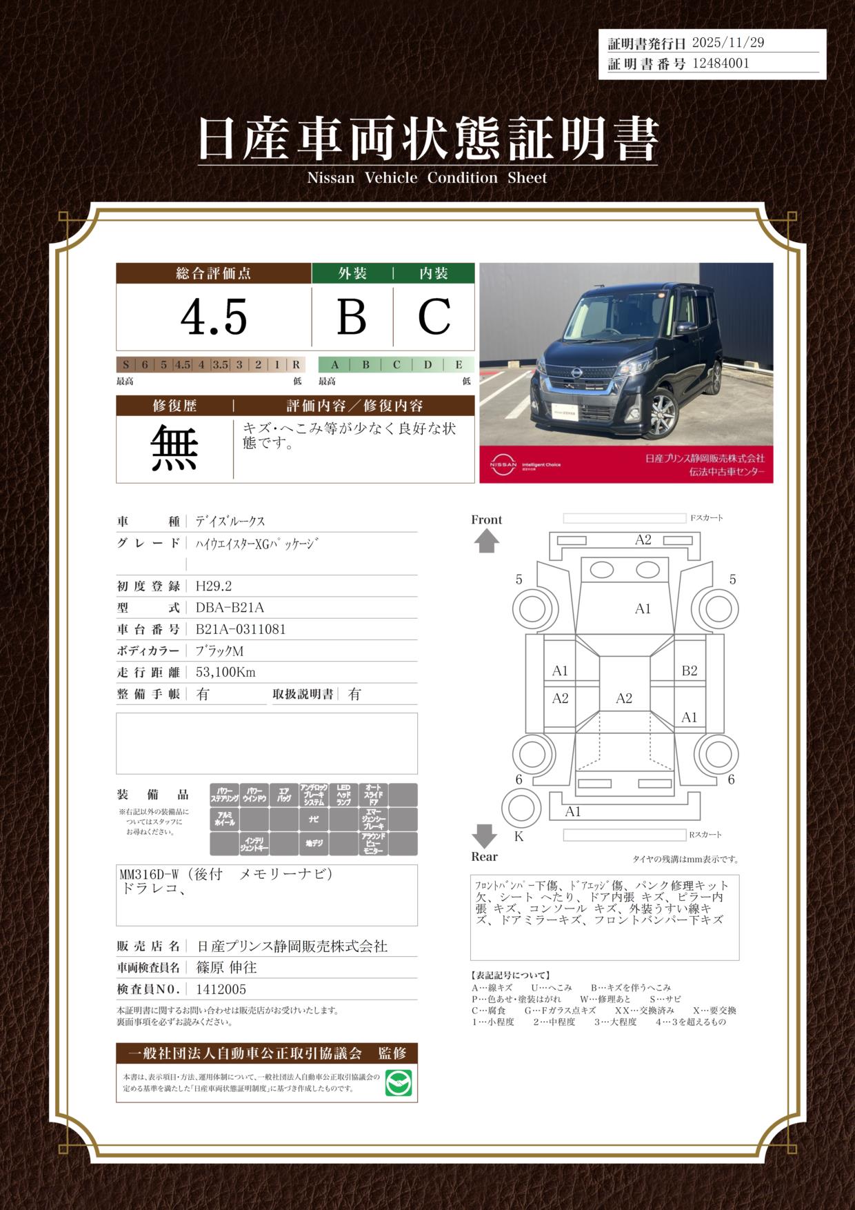 評価機関 : 日産車両状態証明