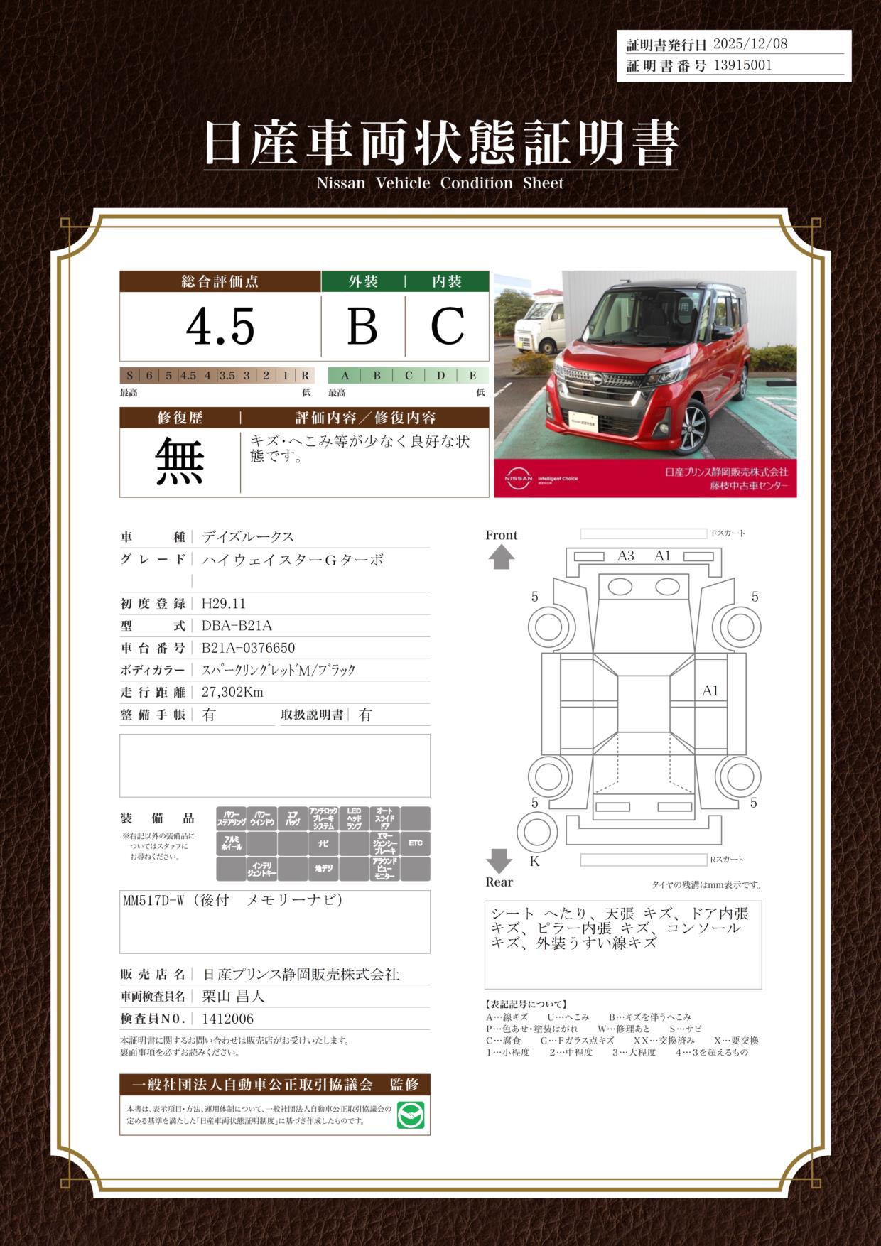 デイズルークス 660cc 660 ハイウェイスターX Gパッケージ 日産純正メモリーナビ付き