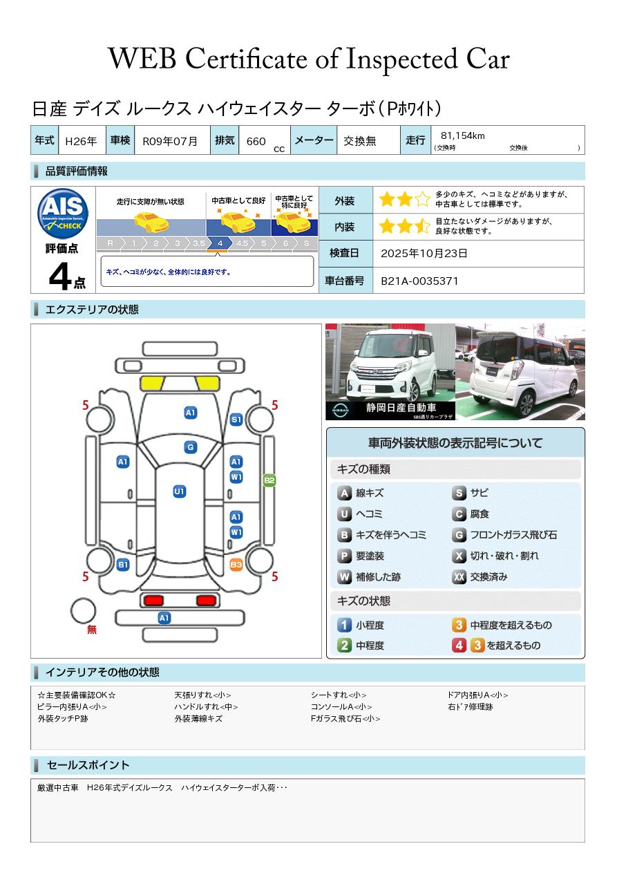 厳選中古車 H26年式デイズルークス ハイウェイスターターボ入荷・・・メモリーナビ 地デジTV アラウンドビューモニター 両側オートスライドドア