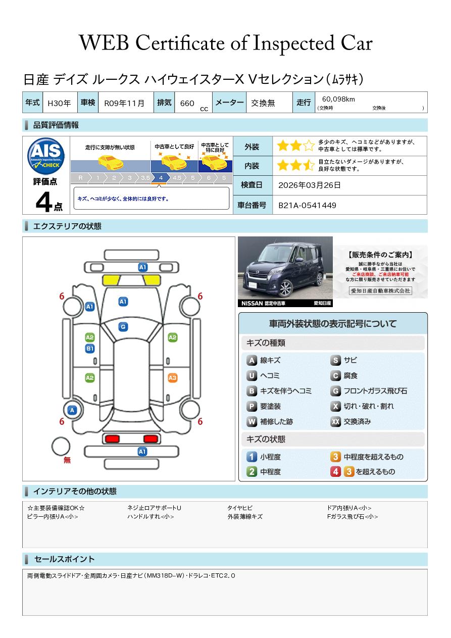 現状括弧書き内の年月まで車検有効期限が残っていますが、ご成約時に新しく車検を取り直します。なお取り直しの費用は車両価格に含まれています。
