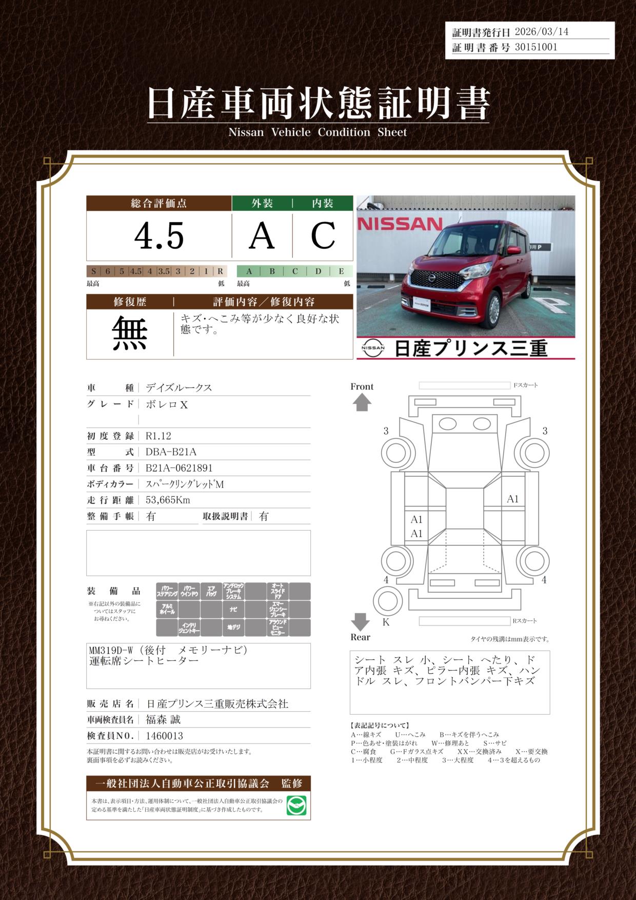 現状括弧書き内の年月まで車検有効期限が残っていますが、ご成約時に新しく車検を取り直します。なお取り直しの費用は車両価格に含まれています。