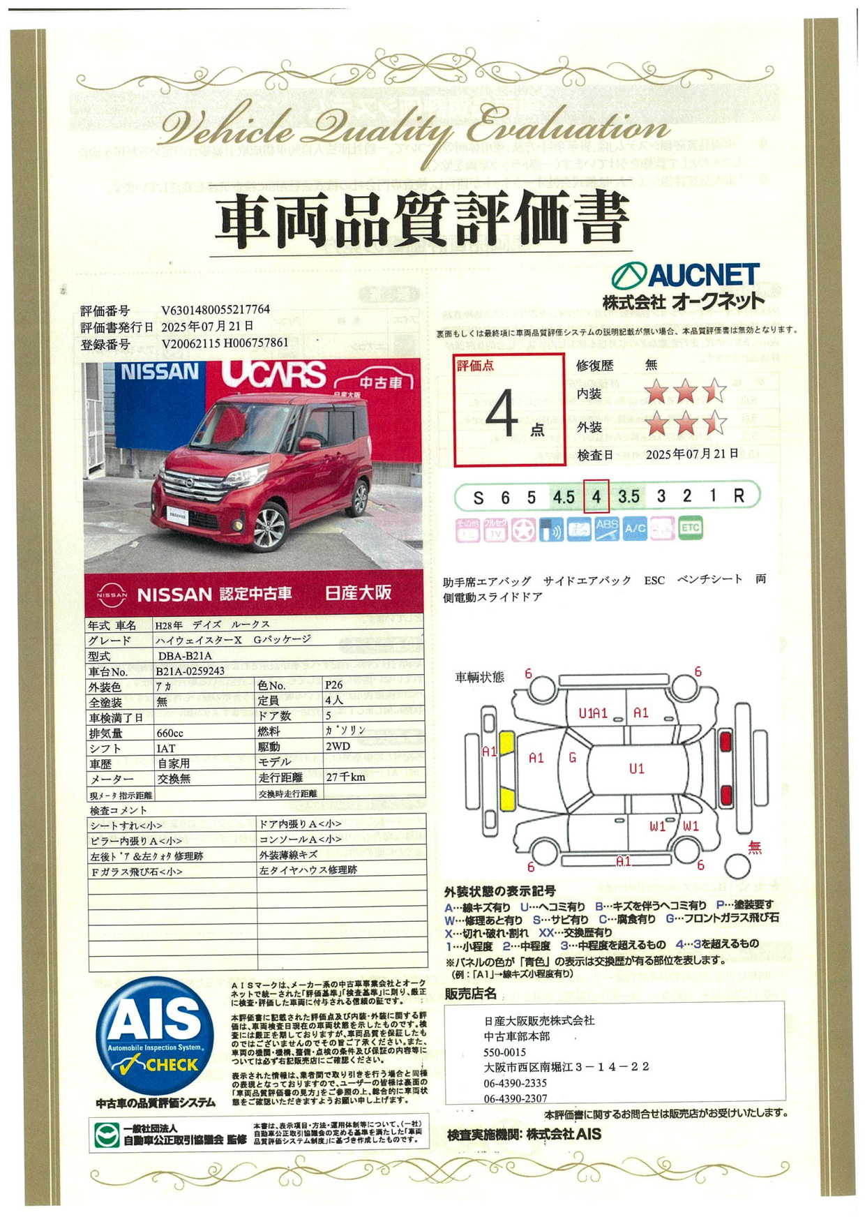 日産大阪UCARS枚方『日産中古車ワイド保証12ケ月』:延長保証もございます。左右オート・エマブレ・前方踏間違防止・キセノン・アラウンドモニタ&ナビTV・ETC・社外品前後ドラレコ