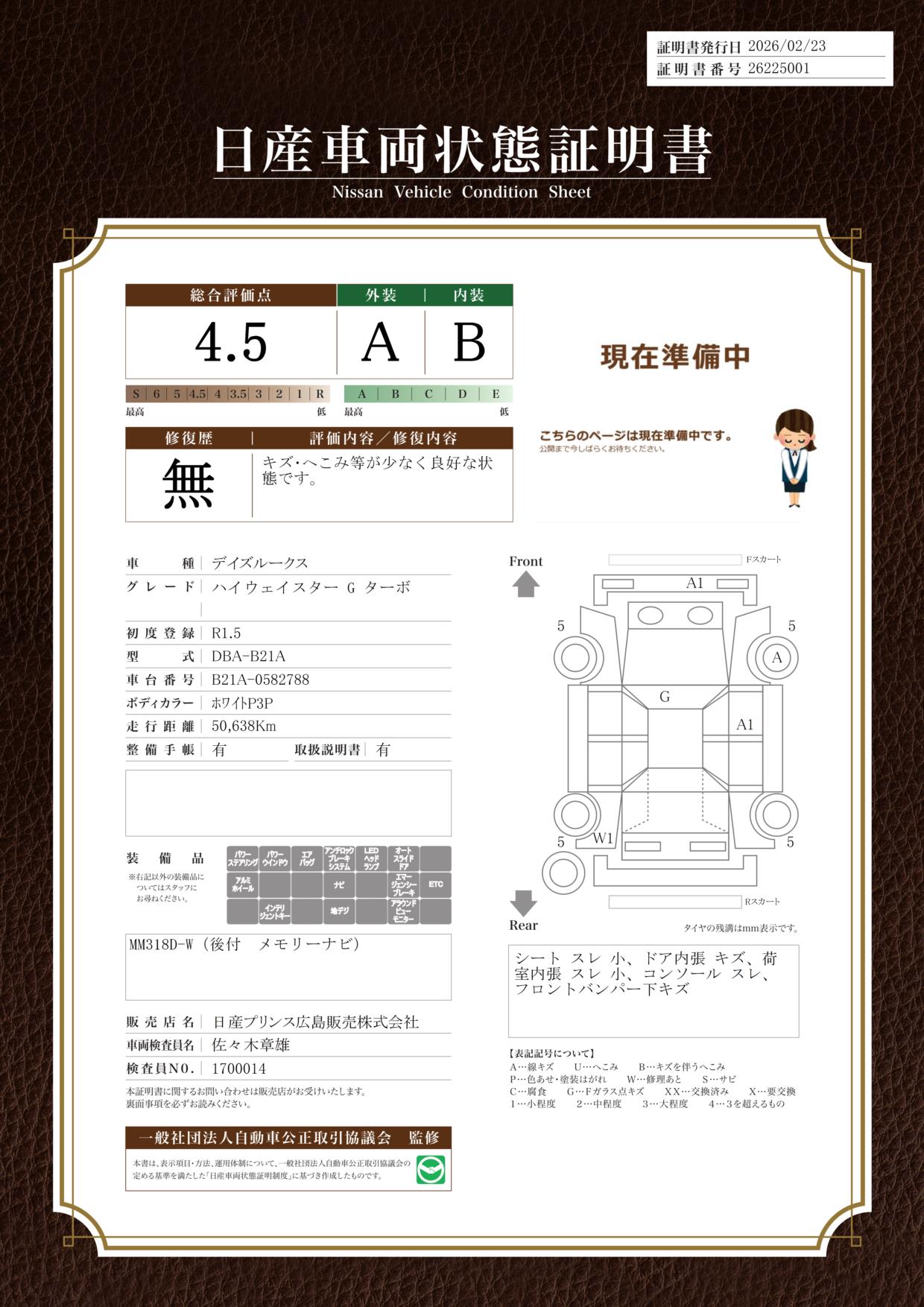 評価機関 : 日産車両状態証明