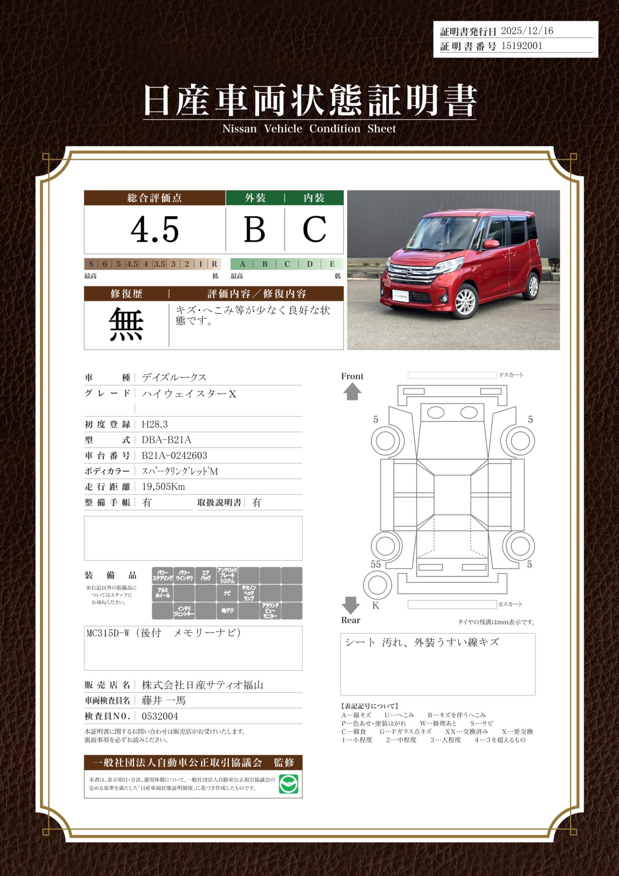 現状車検切れの状態ですが、ご成約時に新しく車検を実施します。車検費用は車両価格に含まれています。