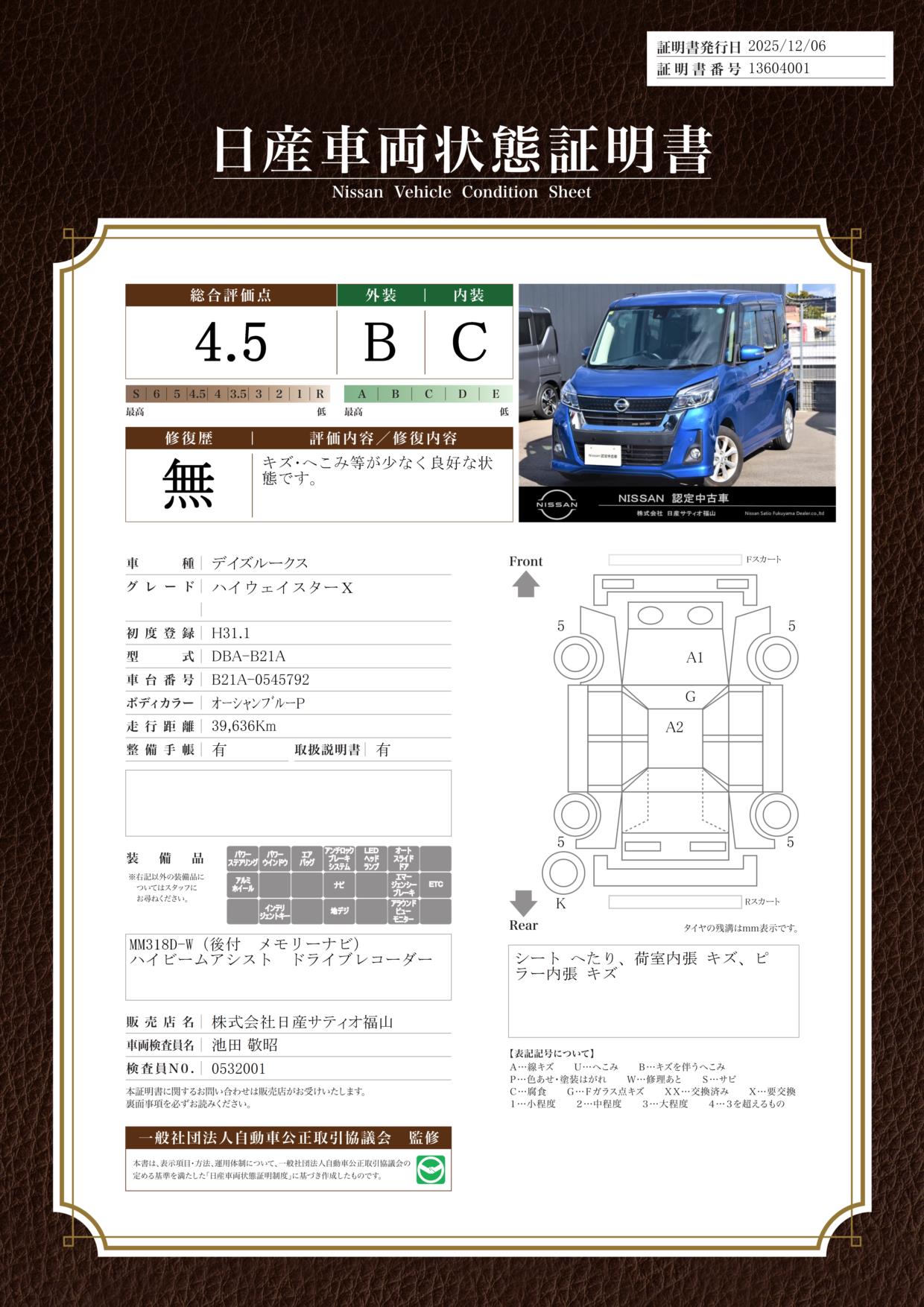 評価機関 : 日産車両状態証明