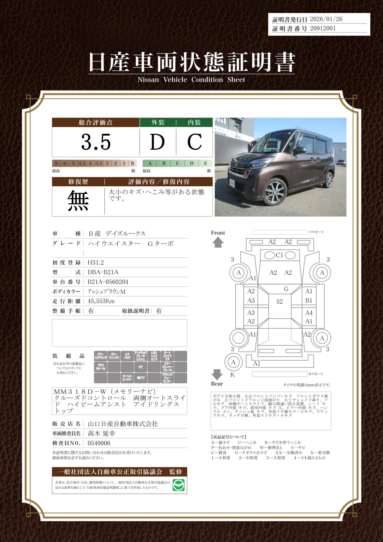 デイズルークス 660cc 660 X 片側オートスライド 純正ナビ付