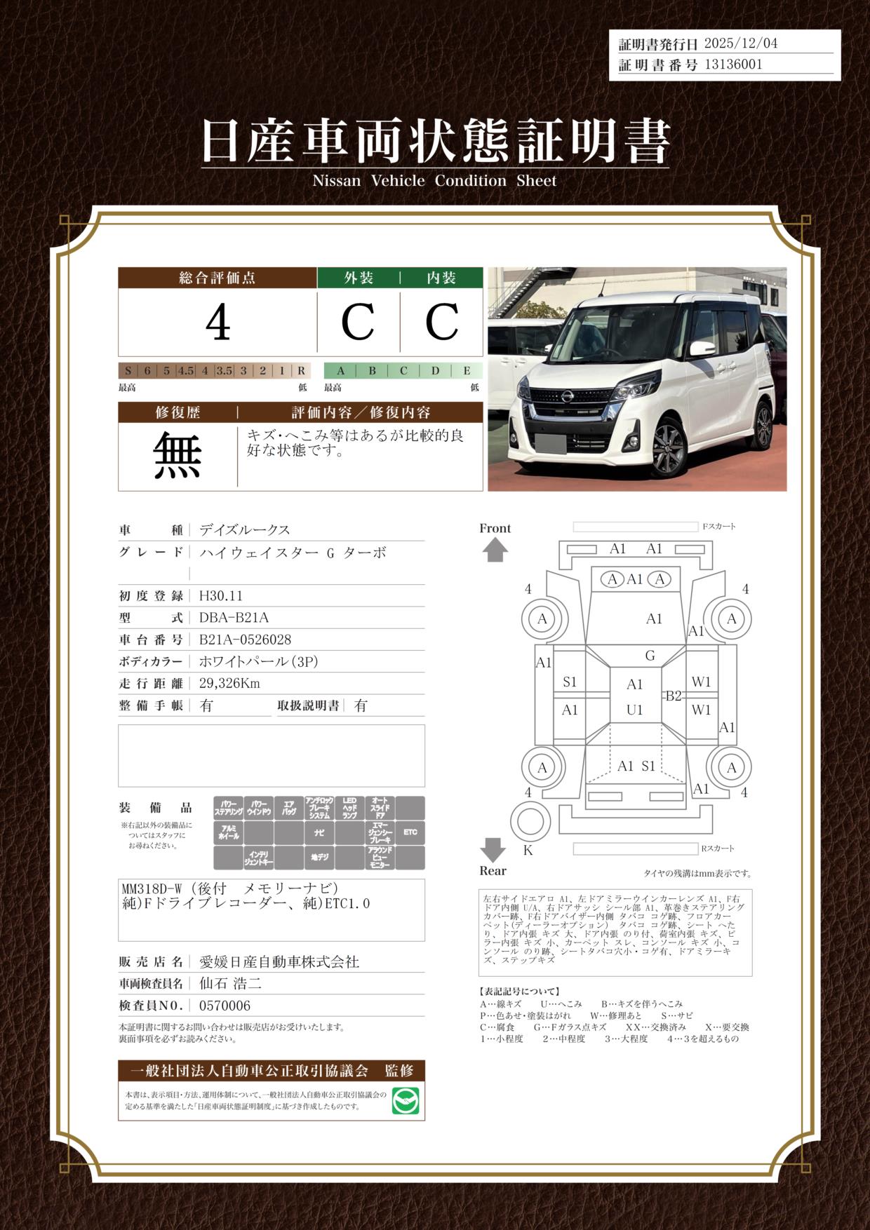 現状括弧書き内の年月まで車検有効期限が残っていますが、ご成約時に新しく車検を取り直します。なお取り直しの費用は車両価格に含まれています。