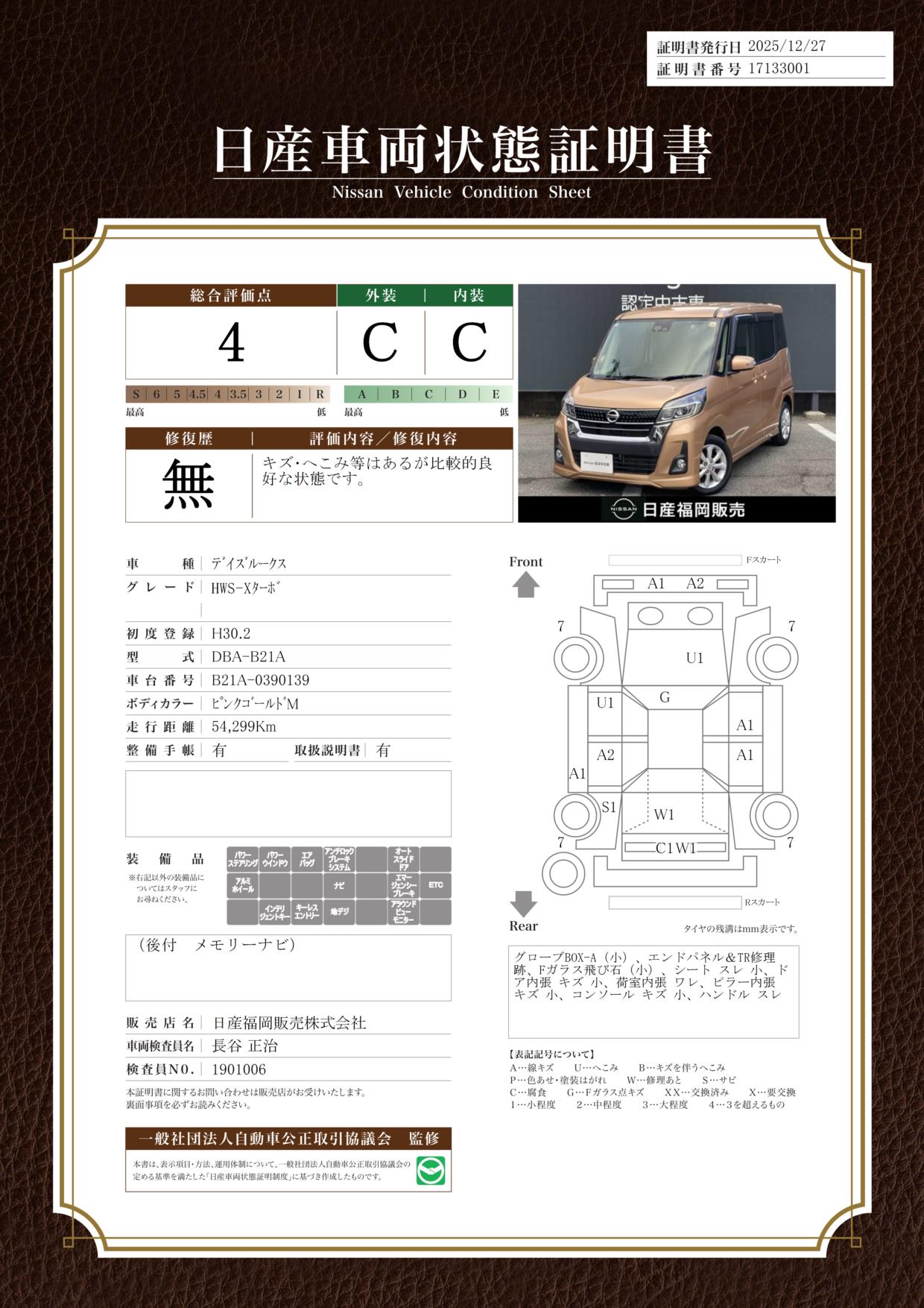 デイズルークス 660cc 660 X Vセレクション ワンオーナー メモリーナビ インテリキー