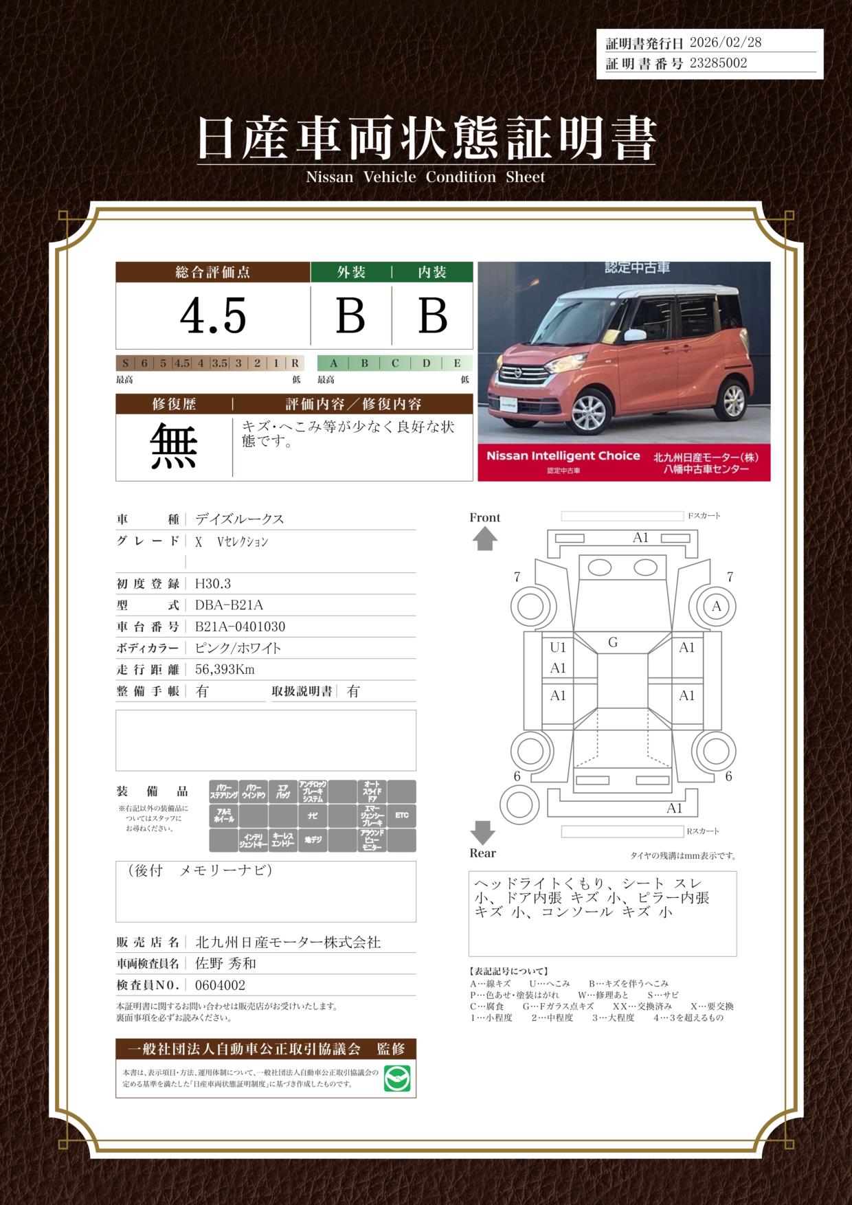 日産 デイズルークス X Vセレクション!法定点検渡・日産ワイド保証・純正ナビ・全周囲カメラ・衝突軽減・横滑防止・両側電動ドア・ETC・ドラレコ・アイドリングストップ
