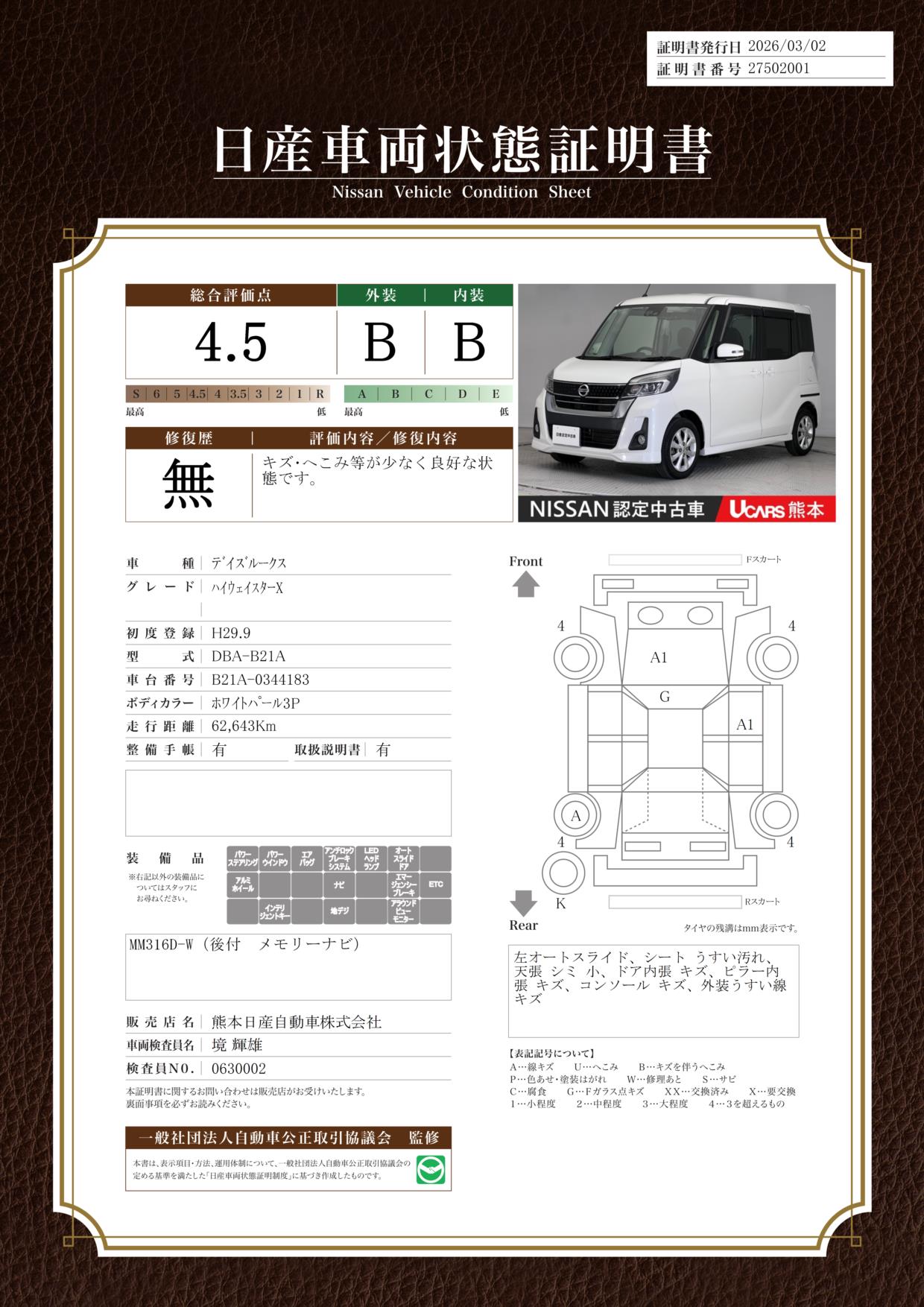 現状括弧書き内の年月まで車検有効期限が残っていますが、ご成約時に新しく車検を取り直します。なお取り直しの費用は車両価格に含まれています。