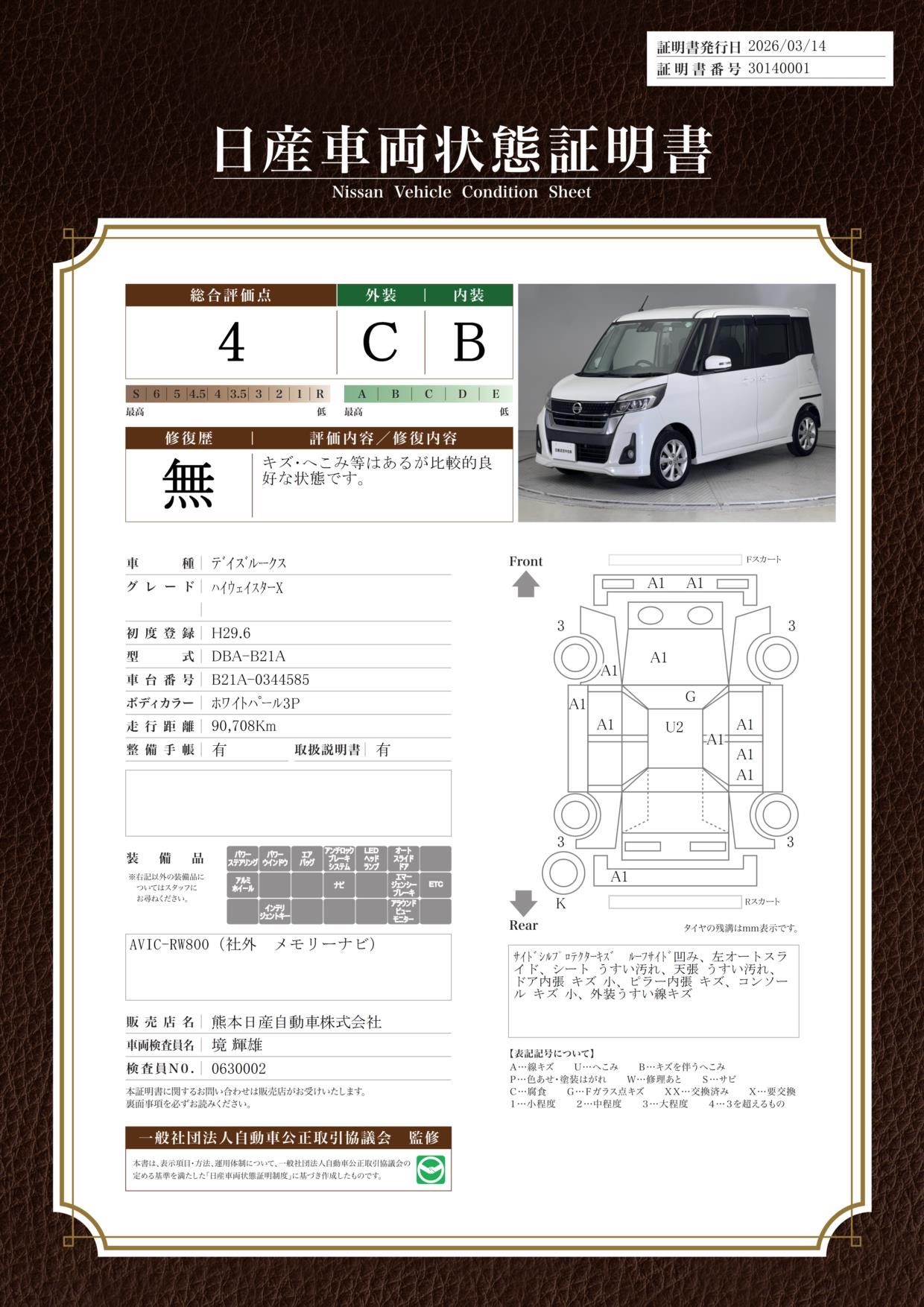 現状括弧書き内の年月まで車検有効期限が残っていますが、ご成約時に新しく車検を取り直します。なお取り直しの費用は車両価格に含まれています。
