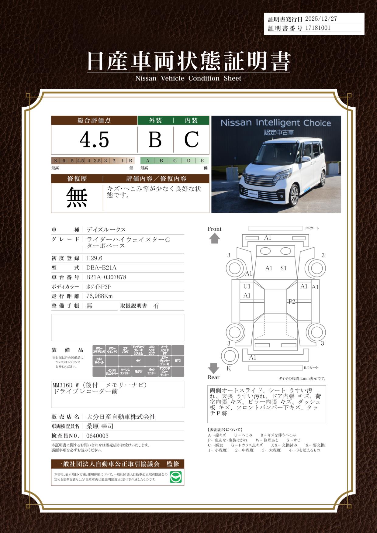 評価機関 : 日産車両状態証明