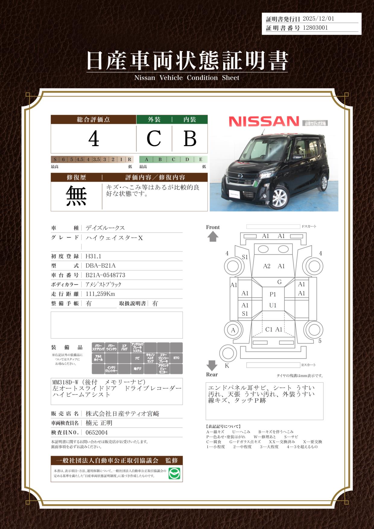 この度は当店を検索頂き誠にありがとうございます。今話題のe-Powerや100%電気で走る軽自動車サクラ、安全装置搭載車を多数展示!価格は総額表示で分りやすく、更に日産のワイド保証付で安心!お買得車を多数ご準備して、ご来場を心よりお待ちしております。12月は『冬のお買得中古車フェア!』を開催!期間R7年12月1日(月)~12月29日(月)迄。毎週、火・水曜日が定休日。